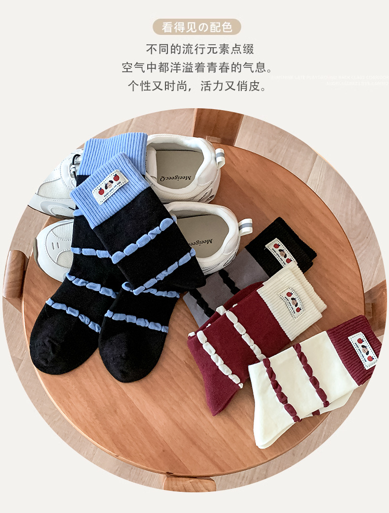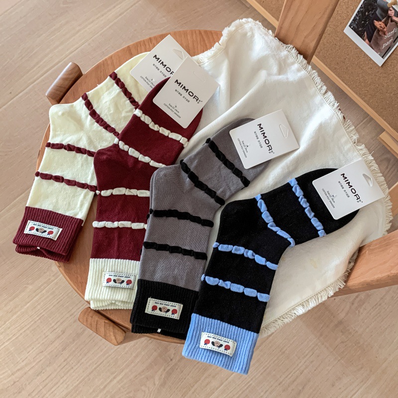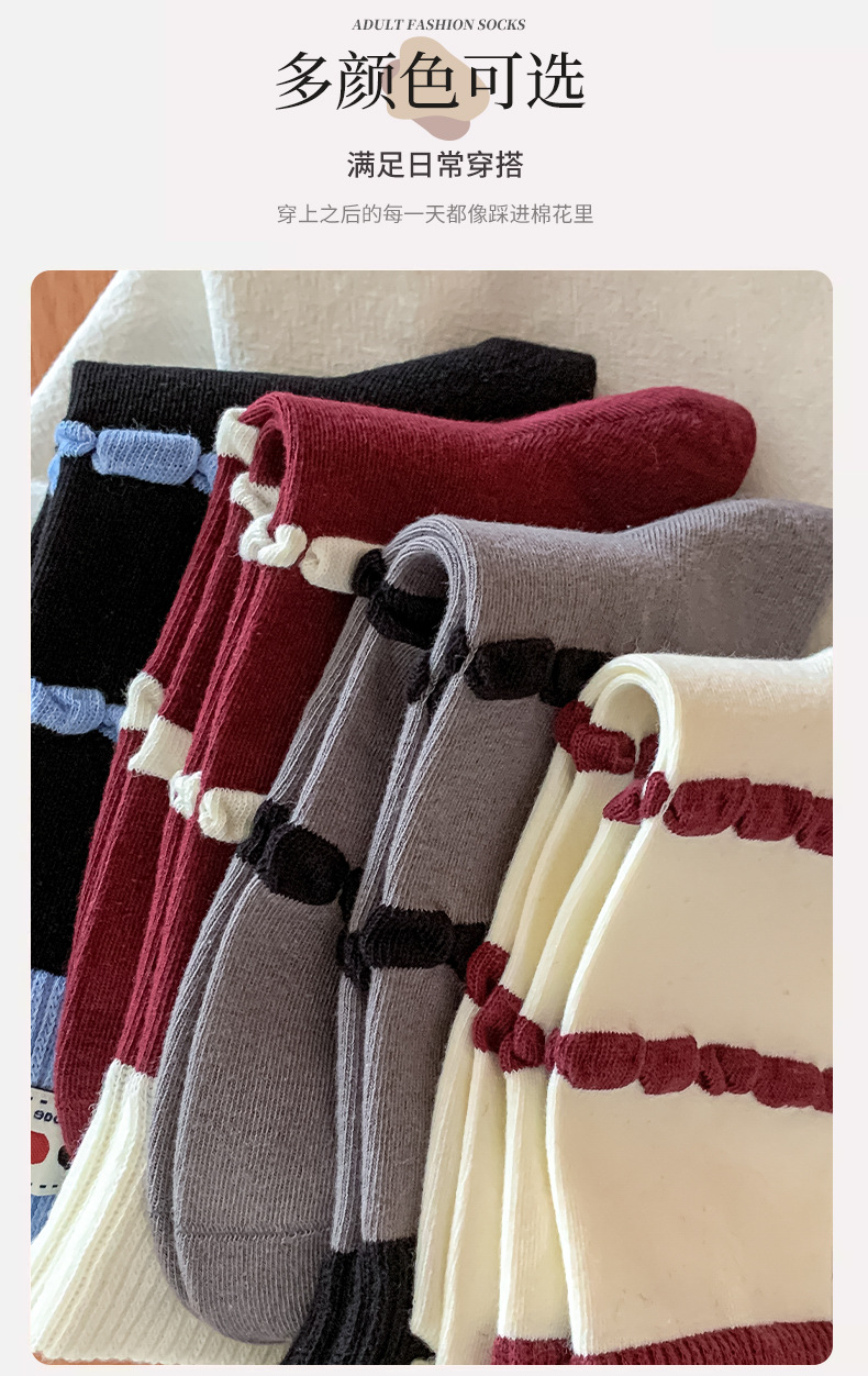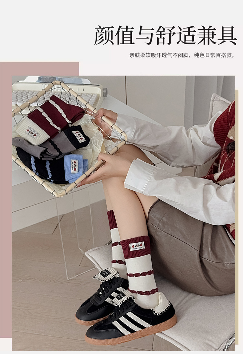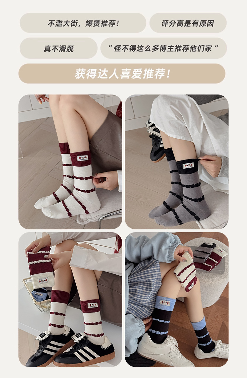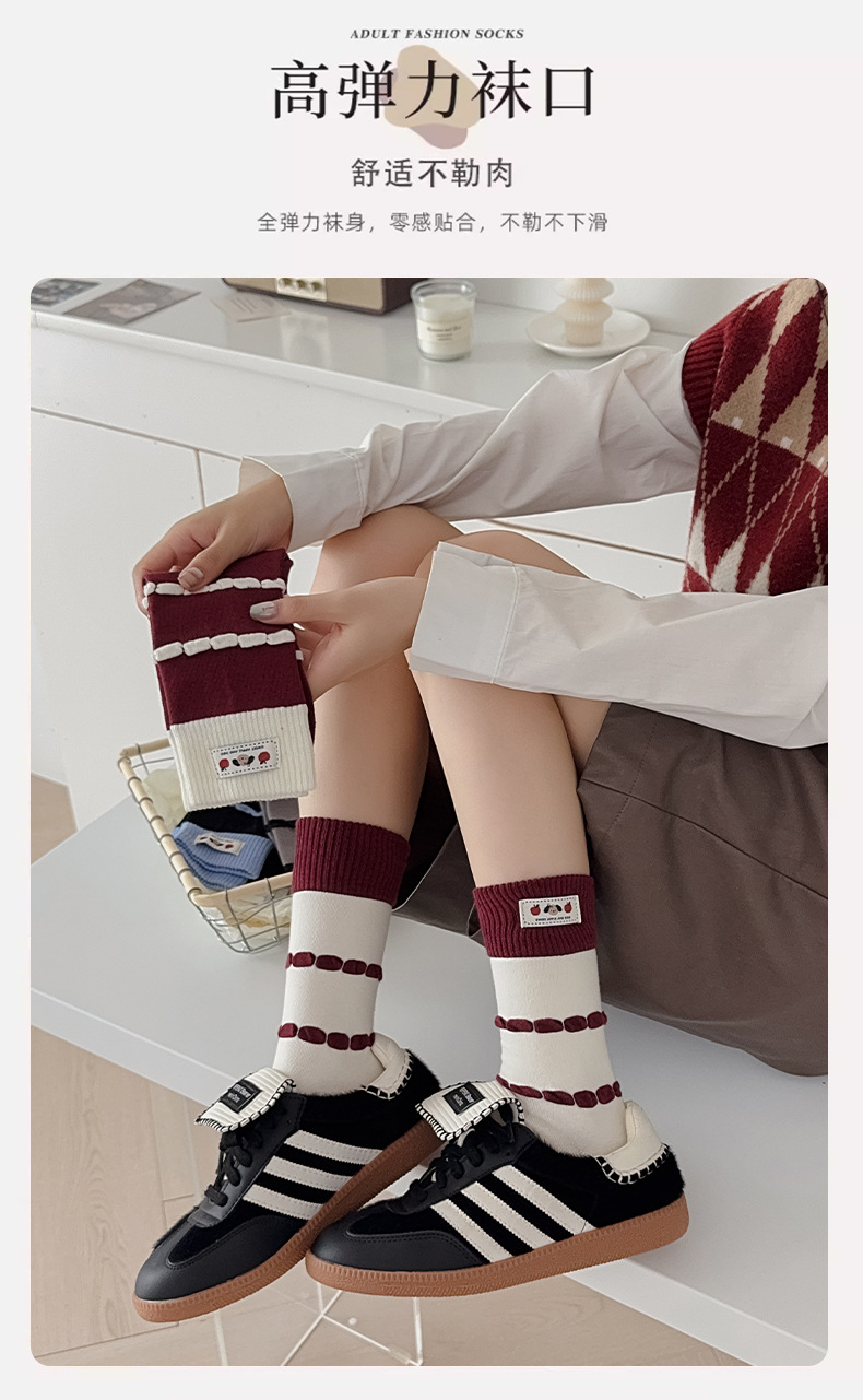面料名称: 棉 筒高: 中筒 主面料成分: 棉 功能: 透气,吸汗,吸湿排汗,防摩擦 品牌: 其他 产品类别: 普通休闲袜 成分及含量: 棉75%聚酯纤维20%氨纶5% 包装形式: 袋装 无骨缝制: 是:手工无骨缝头 图案: 动物图案,拼色,动漫卡通,条纹/格子 适用性别: 女 适用年龄段: 青年(18-40周岁) 针数: 200N 上市时间: 2025年秋季 适合季节: 四季通用 产地: 诸暨 是否跨境出口专供货源: 否 货号: MD25131 颜色: 酒红罗口一双,蓝色罗口一双,黑色罗口一双 尺码: 均码 重量: 0.05 kg/双