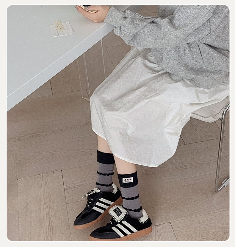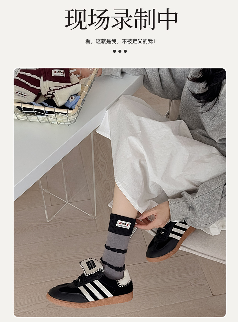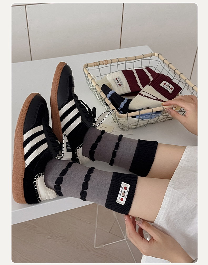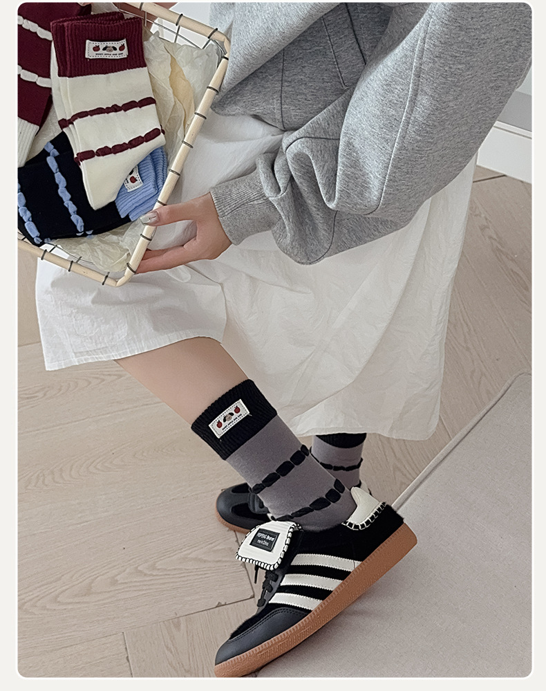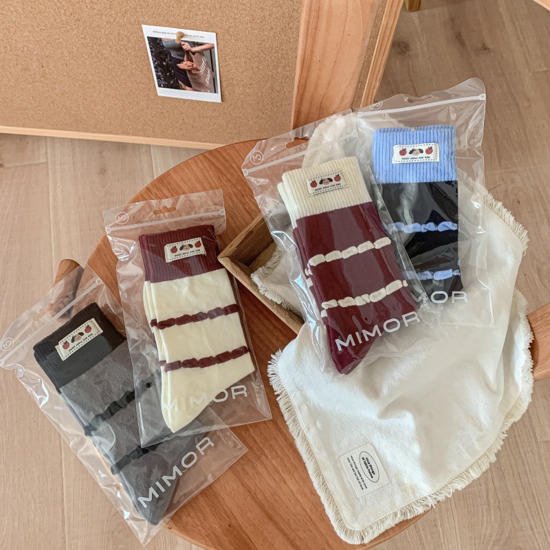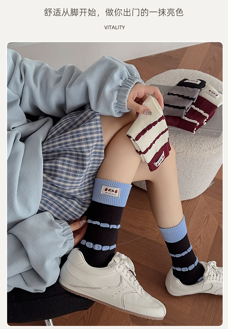 面料名称: 棉 筒高: 中筒 主面料成分: 棉 功能: 透气,吸汗,吸湿排汗,防摩擦 品牌: 其他 产品类别: 普通休闲袜 成分及含量: 棉75%聚酯纤维20%氨纶5% 包装形式: 袋装 无骨缝制: 是:手工无骨缝头 图案: 动物图案,拼色,动漫卡通,条纹/格子 适用性别: 女 适用年龄段: 青年(18-40周岁) 针数: 200N 上市时间: 2025年秋季 适合季节: 四季通用 产地: 诸暨 是否跨境出口专供货源: 否 货号: MD25131 颜色: 酒红罗口一双,蓝色罗口一双,黑色罗口一双 尺码: 均码 重量: 0.05 kg/双