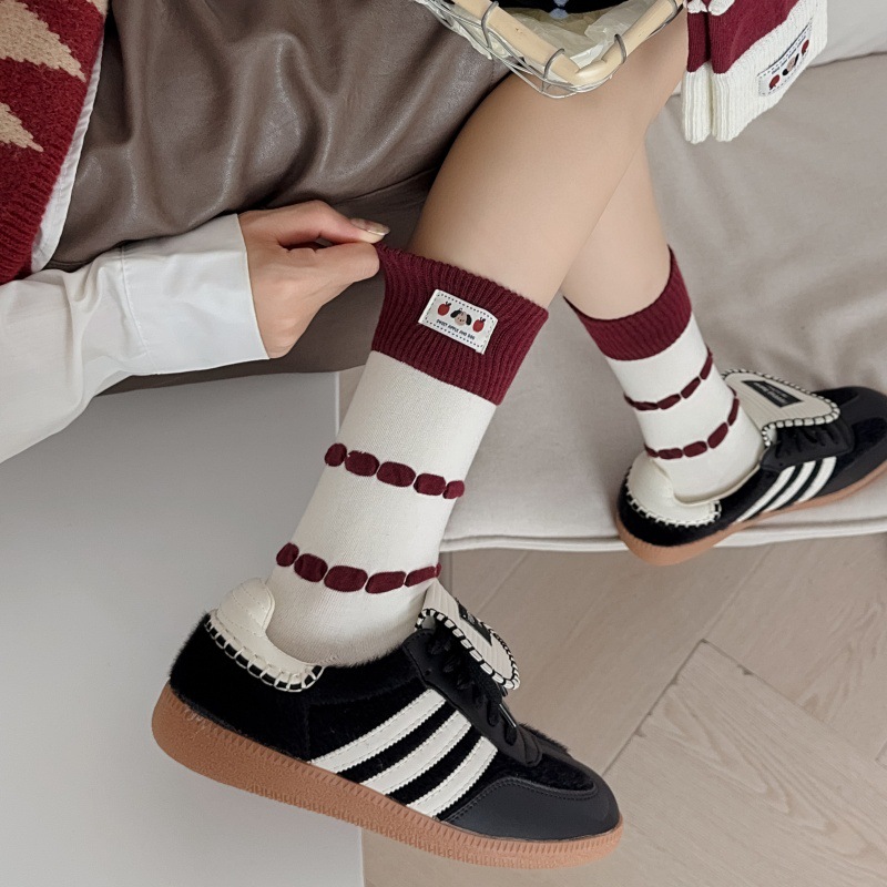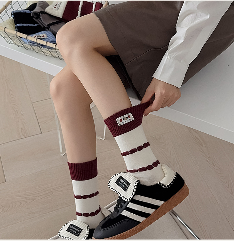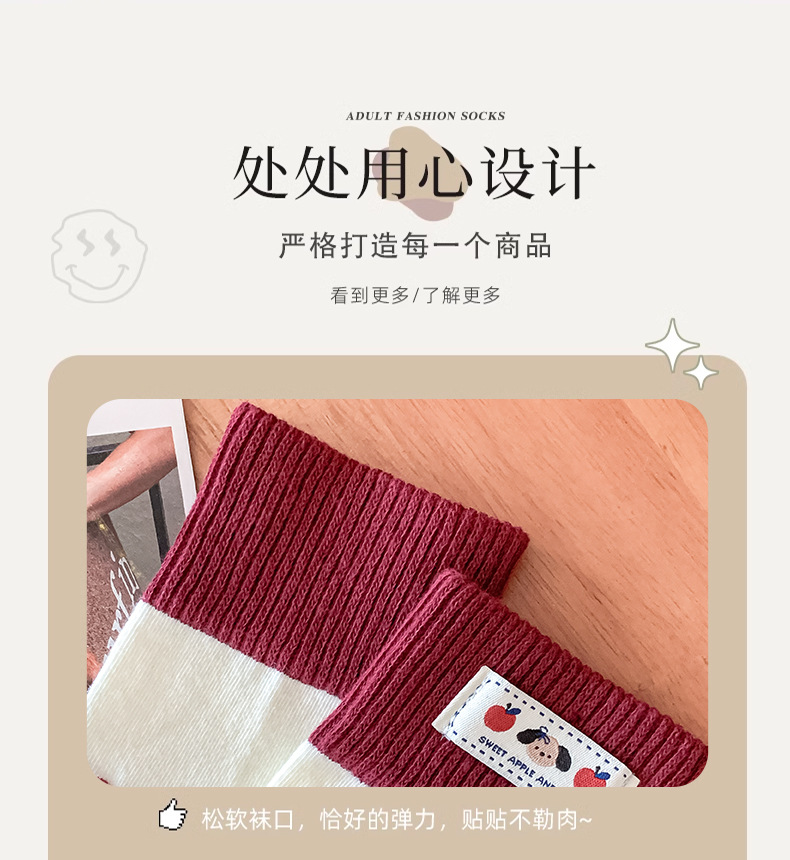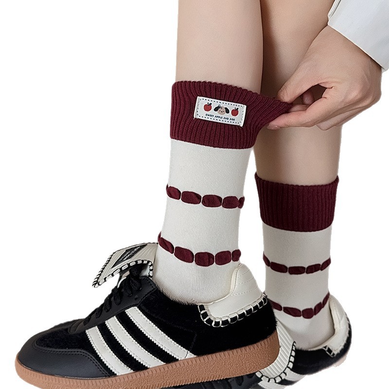 韩国袜子女卡通小狗布标中筒袜时尚拼色条纹堆堆袜酒红色无骨袜子 English | 投诉