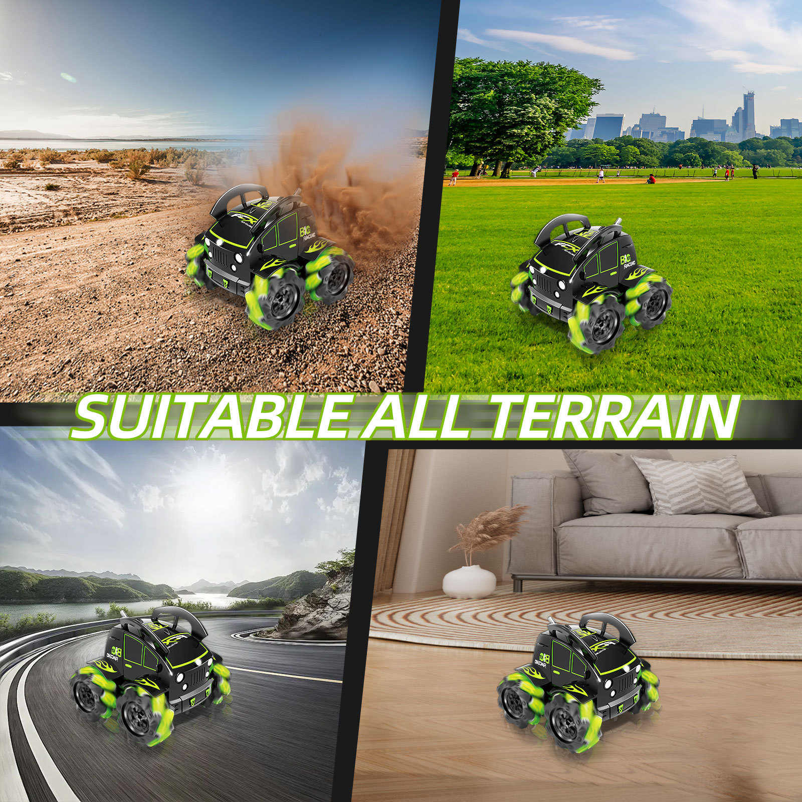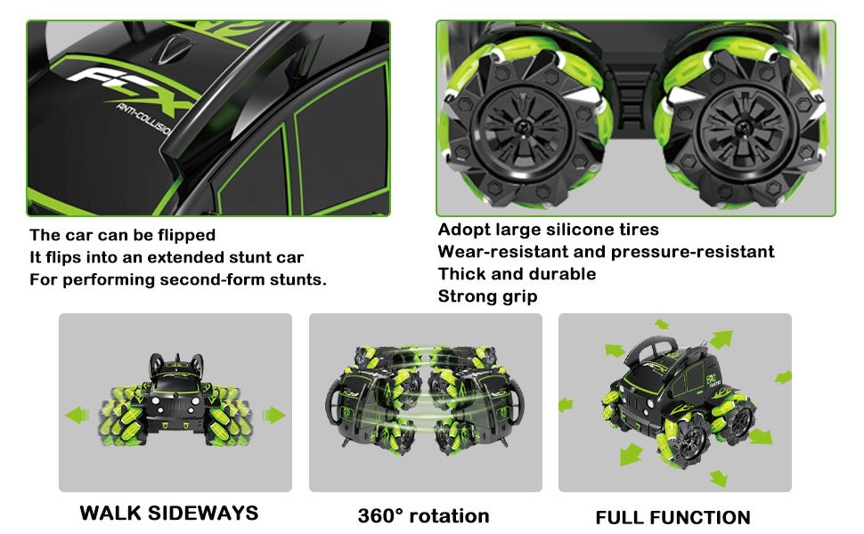 前进、后退。左侧漂移行驶,右侧漂移行驶,45度左漂移,45度右漂移,360度翻滚,360度站立旋转,90度站立行驶