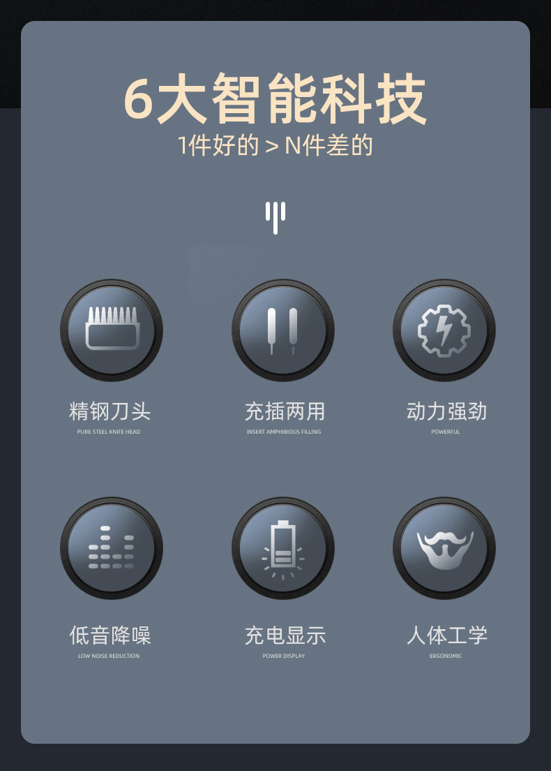 用户痛点解决方案:静音操作减少不适,轻松实现个性化发型。品牌背书:通过国际认证,品质可靠。情感共鸣:让理发成为享受,自信从头开始。