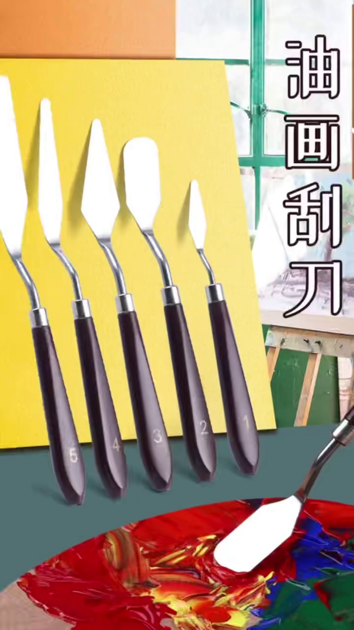 特点:刀片轻薄、富弹性。刀面与柄之间有弯曲的金属杆链接,避免作画时手指触及画面颜色,同时又使画刀在控制上更为灵活自由