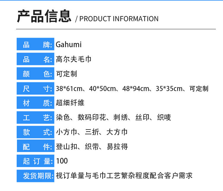 材质: 超细纤维 功能: 吸湿 吸水性: 26-30s 品牌: Gahumi 产品类别: 运动巾 制作工艺: 绣花,包边 克重: 400 货号: 0824 加工定制: 是 加印LOGO: 可以 纱线工艺: 股纱,混纺纱,精梳纱 纱线规格: 16支,40支,21股 是否定制: 是 是否支持一件代发: 不支持 颜色: 可订不同颜色logo,灰色 规格(长*宽cm): 40×40cm 主要下游平台: 亚马逊 主要销售地区: 欧洲 有可授权的自有品牌: 是 是否跨境出口专供货源: 是