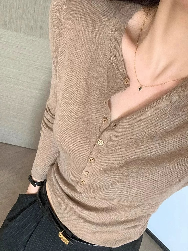 老钱风精纺羊毛针织衫女修身正肩上衣25新款秋冬v领修身内搭打底