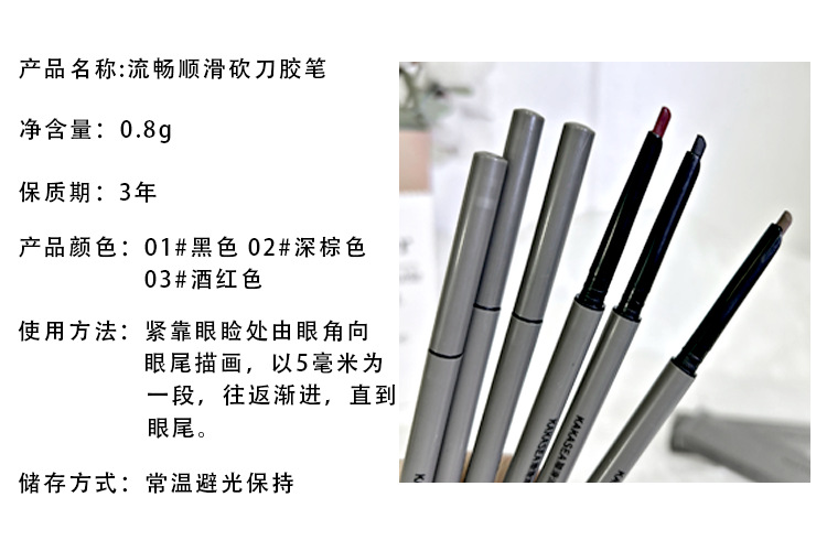 品牌: kaka sea 规格: 正常规格 产品类别: 眼线笔 颜色: 棕色,黑色 品牌类型: 国货品牌 是否进口: 否 生产许可证号: 浙妆20170036 货号: 864 颜色分类: 黑色,棕色,酒红色 是否跨境出口专供货源: 否 适用肤质: 中性 特殊用途化妆品: 否 产地: 广东 适用人群: 普通人群 保质期: 3年 产品名称: 刀锋眼线胶笔 重量: 0.002 kg/支 装箱信息:长宽高:1X1X1cm 装箱重量: 1KG 装箱数量:1pcs
