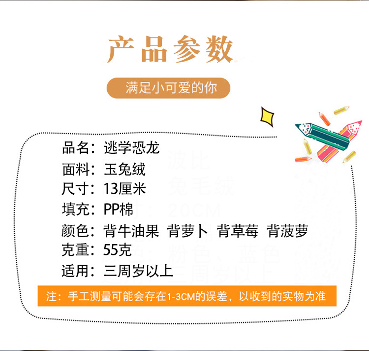 填充材质: PP棉 品牌: 佳乐 适用年龄: 少年(7-14岁) 造型类别: 卡通 毛绒分类: 玉兔绒 是否专供外贸: 否 所属分类: 毛绒公仔 造型是否卡通、动漫: 否 包装方式: 网袋 是否多功能: 否 货号: 逃学恐龙 加工定制: 是 加工方式: 来样定制 专利及著作权: 实用新型 专利及著作权申请时间: 咨询客服 是否有导购视频: 否 产地: 中国 3C配置类别: 14岁以下的毛绒玩具 颜色: 背菠萝,背草莓,背萝卜,背牛油果 高度: 13厘米 重量: 0.373 kg/个