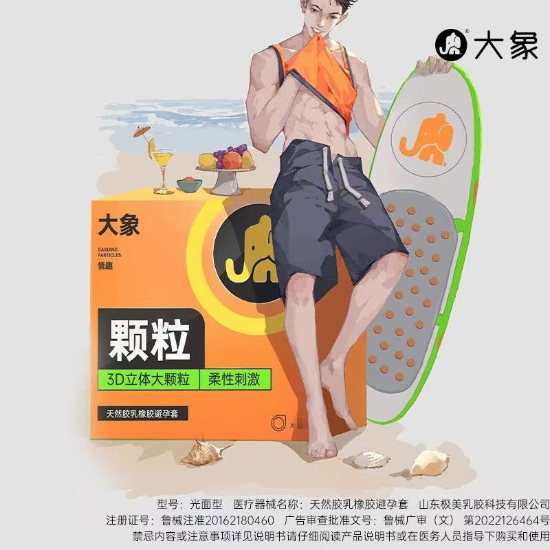 生产企业: 中国大陆 品牌: 大象 药(械)准字: 鲁械注准20162180063 产品名称: 大象情趣颗粒3只装 保质期: 5年 材质: 乳胶 是否进口: 否 商品条形码: 6936406103400 械(X)字号: 鲁械注准20162180063 尺寸: 中号 功能: 避孕 厚度: 超薄型 外观形状: 颗粒 香型: 无 颜色: 原色 包装规格: 3 品牌类型: 国货品牌 产地: 中国大陆 货号: 01.901 产品标准: 见包装 重量: 0.05 kg/盒
