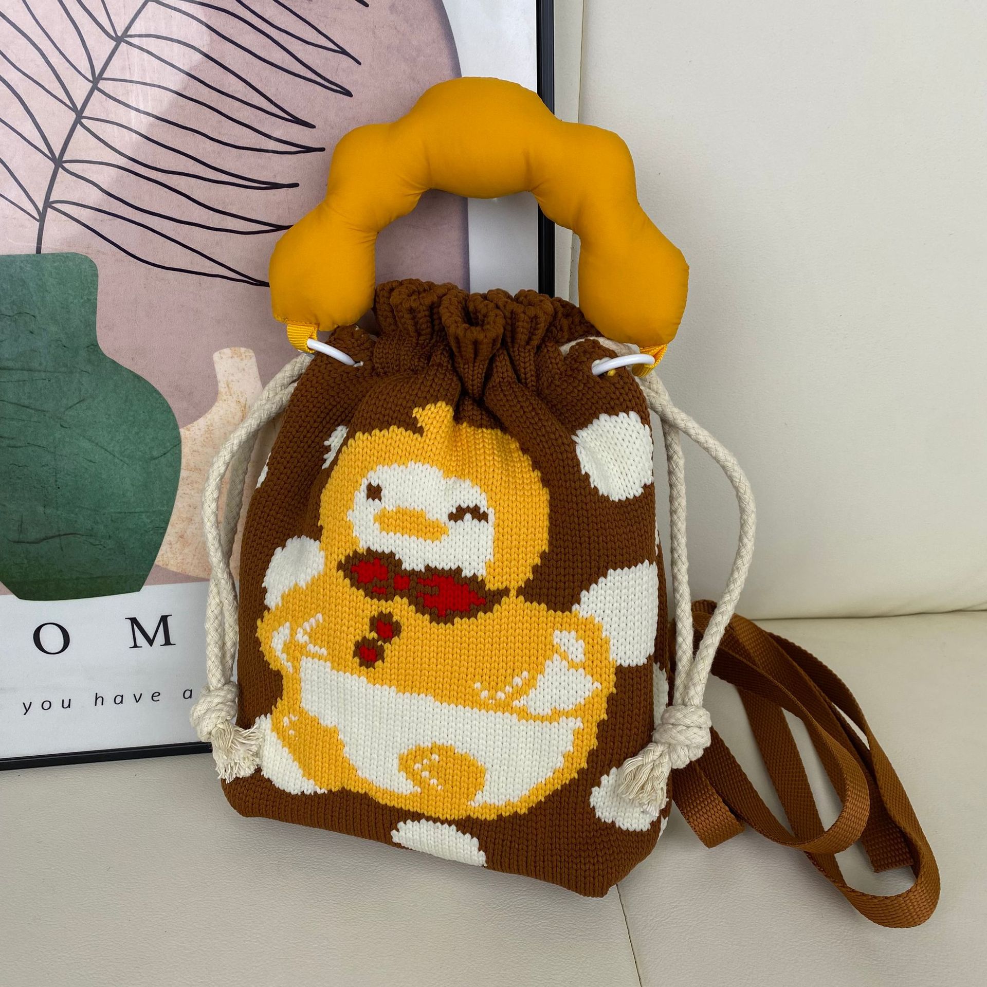 新款高级感手柄抽绳流行卡通图案可爱手提收纳包包单肩斜挎手机包