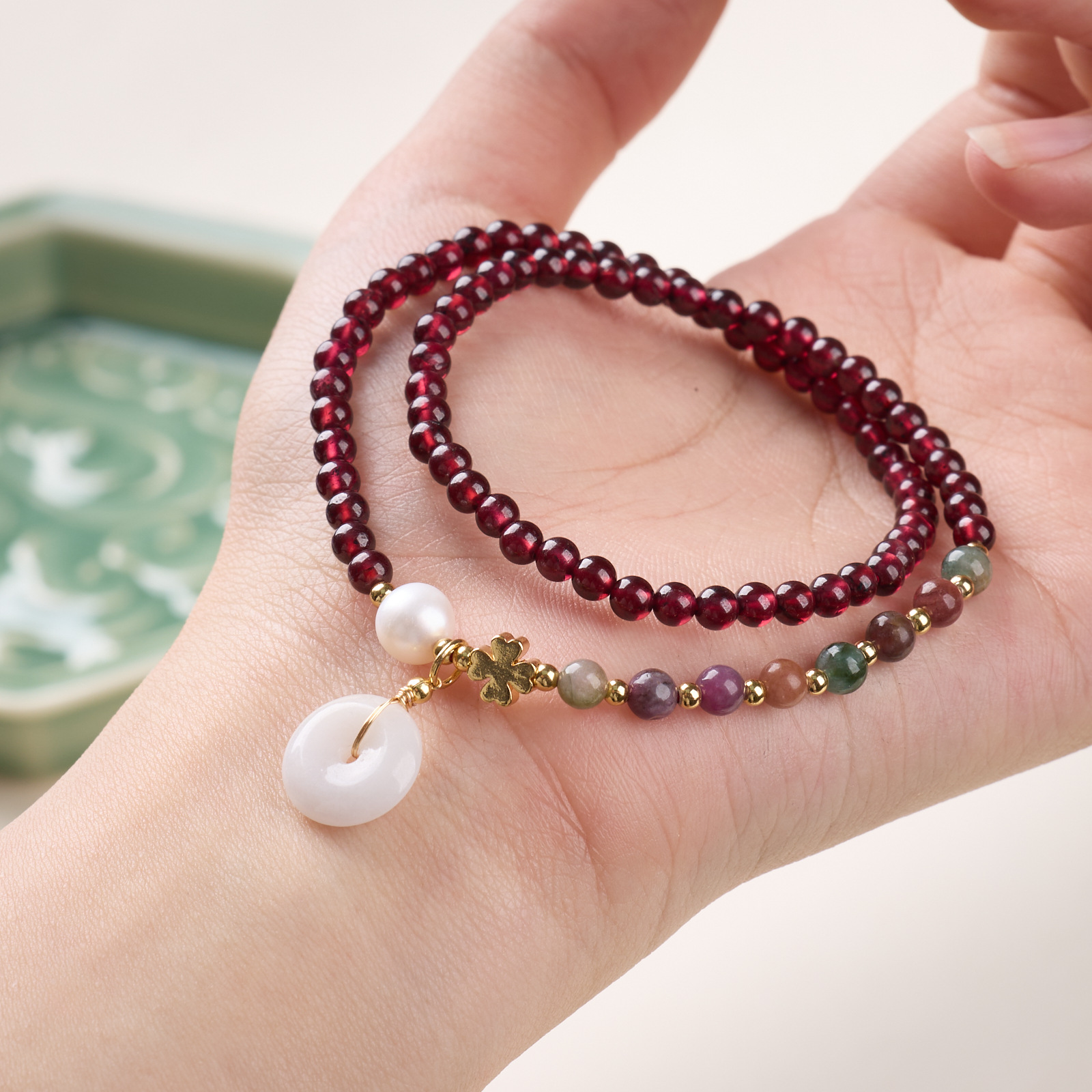 |名称|4MM石榴石 碧玺 淡水珍珠 翡翠平安扣 双圈手链
