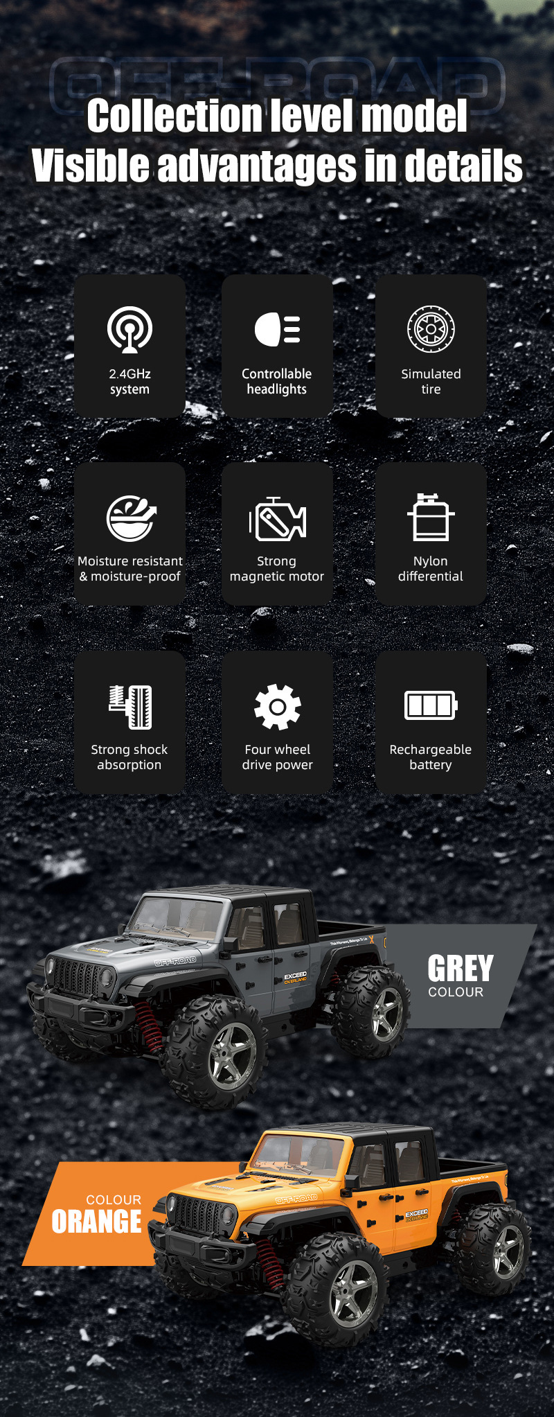1.产品使用前后差速器,全比例油门、转向,使高速车操控性能更加稳定,适合做各种竞技的高难度动作;