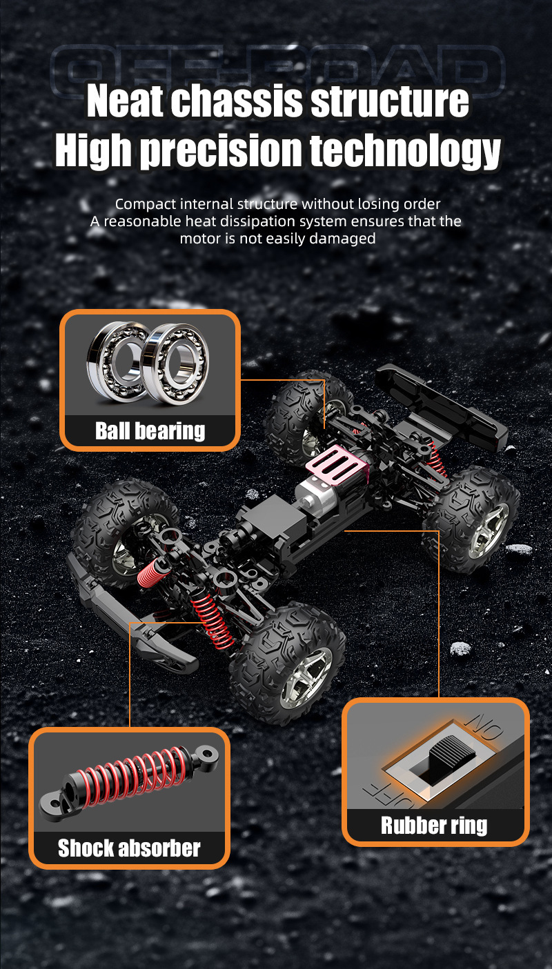 4.全车机身结构、牙轮车底构件、悬挂、摇臂等均采用工程尼龙料制造而成,使高速车更抗摔打,使用寿命长,模型级底盘高精内部车身结构配置,配置专业抬头轮,可以翘头,抬头行驶,飞坡落地时更好调节车身稳定性;
