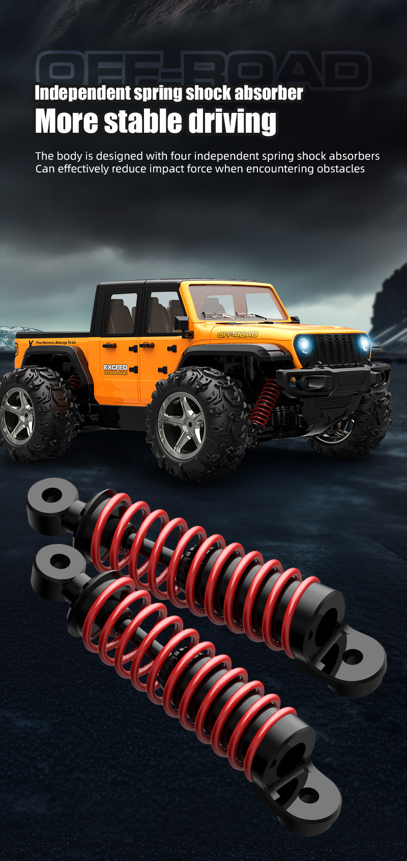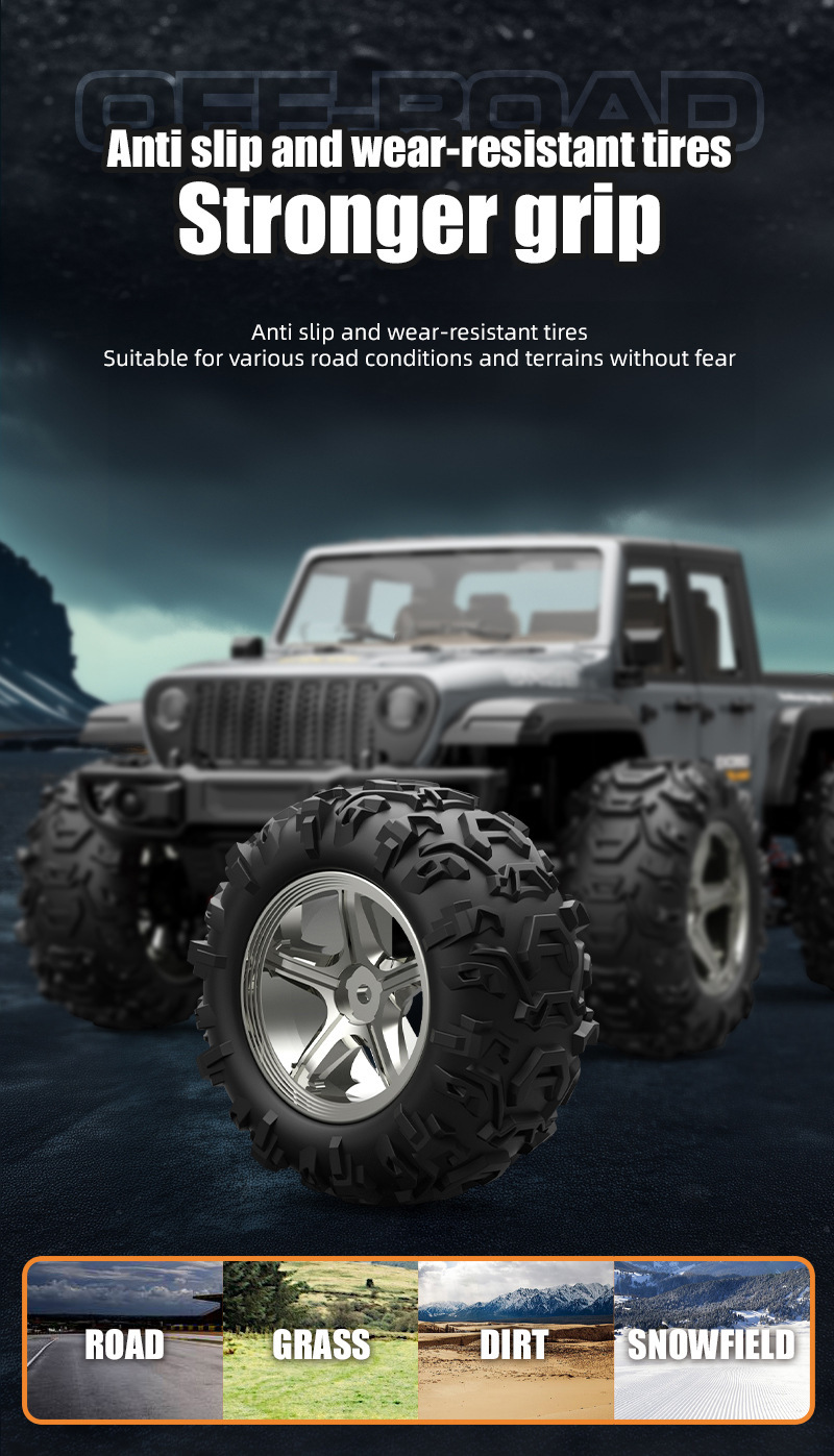 2.全车配备全比例标准舵机,四轮驱动系统,四轮独立悬挂系统,全车滚珠金属轴承,使高速车平衡性,稳定性能更好,具备更强劲动力,适合上各种复杂路况,对于大于45°斜坡可即时通过;