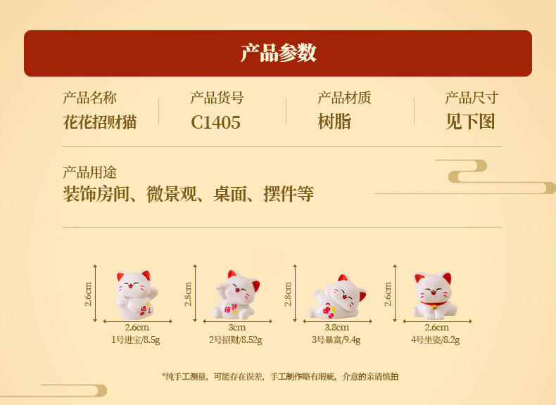 材质: 树脂 类别: 树脂工艺品 风格: 卡通 包装: 普通包装 货号: C1405 是否专利货源: 否 颜色: 1号进宝,2号招财,3号暴富,4号坐姿 尺寸: 花花招财猫 是否属于礼品: 否