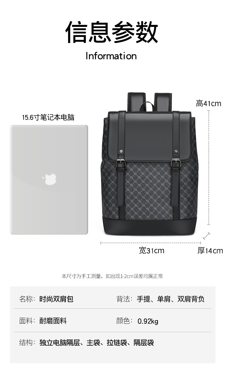 材质: PU 功能: 透气 容纳电脑尺寸: 15英寸 品牌: 其他 背负系统: 气垫背带 里料质地: 涤纶 皮质特征: 其他 颜色: 黑色纯色,黑色花纹 适用性别: 中性/男女均可 适用场景: 商务出行 风格: 休闲旅行 容量: 20-35L 上市年份季节: 2025夏季 货号: ds&4364 图案: 格纹 流行元素: 格纹 有可授权的自有品牌: 否