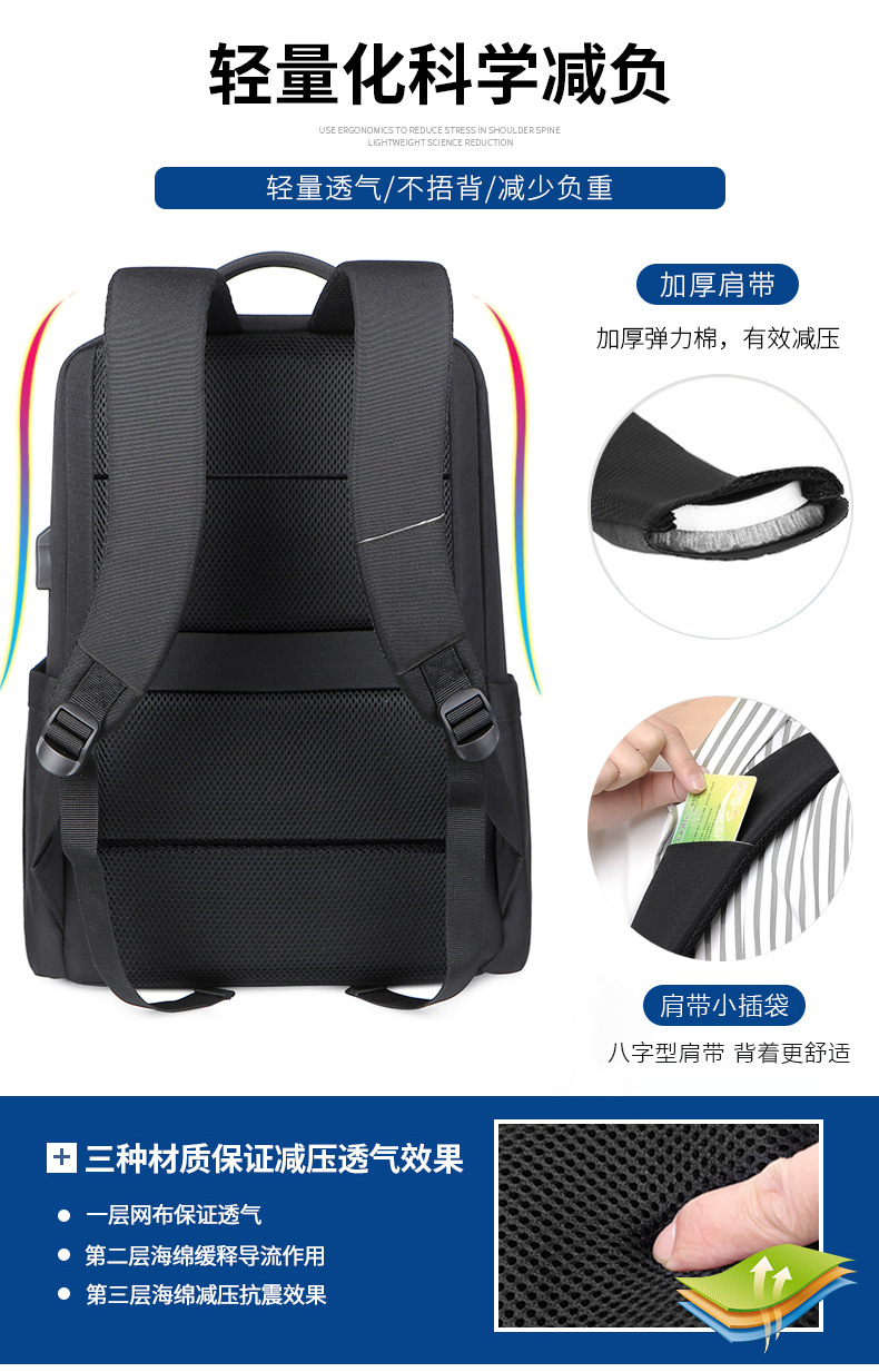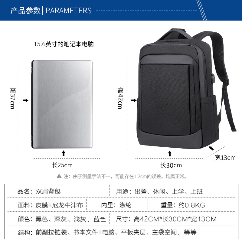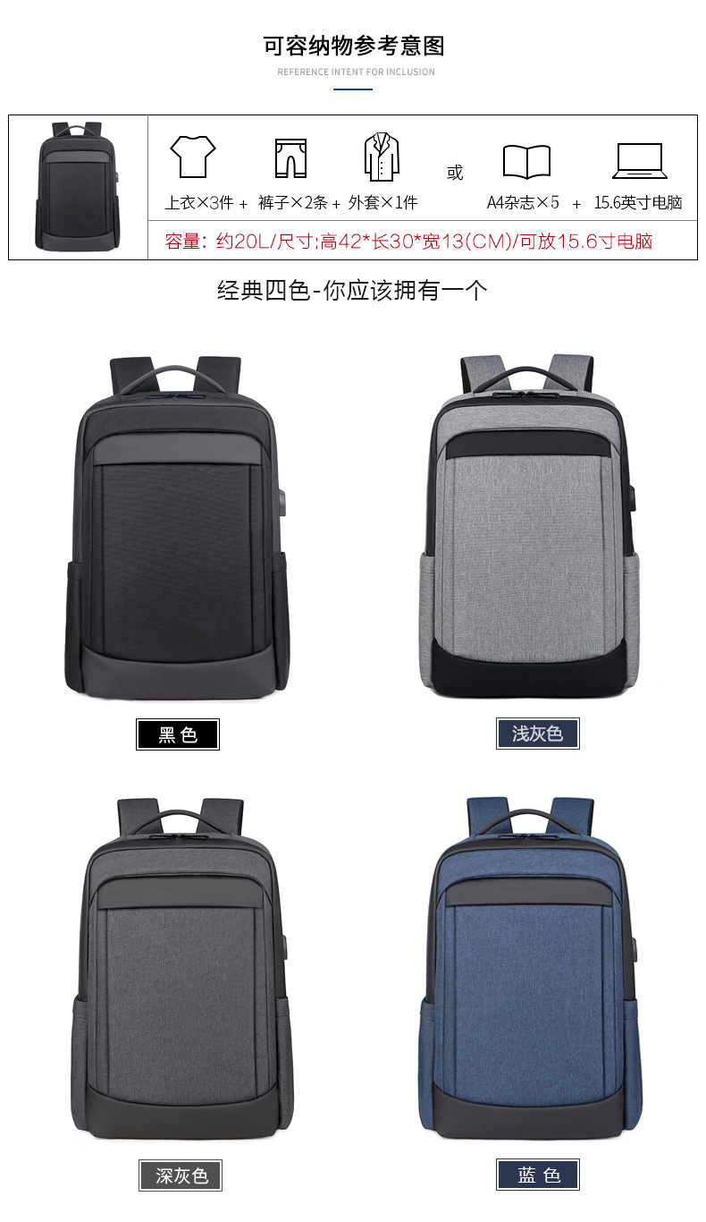 材质: 牛津布 功能: 耐磨 容纳电脑尺寸: 16英寸 品牌: ---- 背负系统: 气垫背带 里料质地: 尼龙 颜色: 浅灰色,深灰色,黑色,深蓝色 尺寸: 均码 适用性别: 中性/男女均可 适用场景: 商务出行 风格: 都市简约 容量: 20-35L 上市年份季节: 2023年冬季 货号: 1106 图案: 纯色 流行元素: 拼接 有可授权的自有品牌: 是