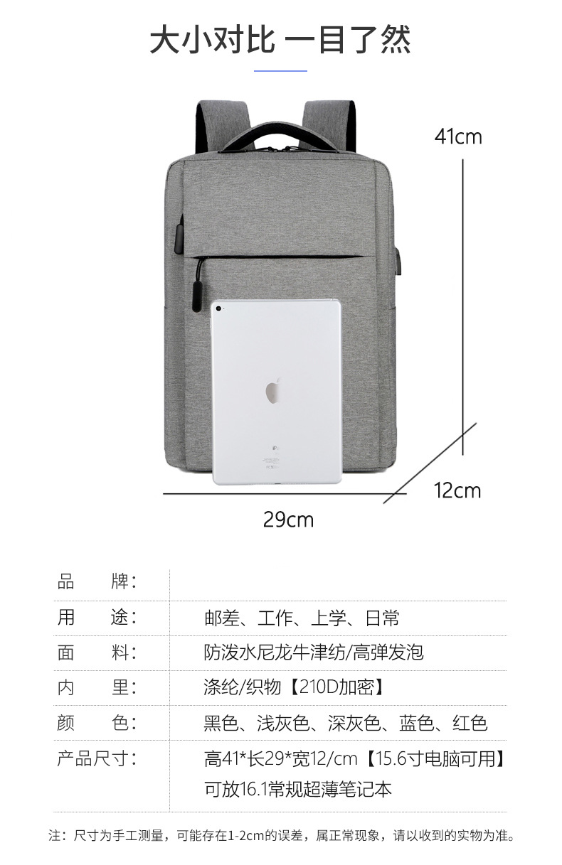 材质: 牛津布 功能: 防水 容纳电脑尺寸: 16英寸 品牌: 其他 背负系统: 弧形肩带 里料质地: 涤纶 皮质特征: 无 颜色: 浅灰色,深灰色,黑色,蓝色,红色 尺寸: 均码 适用性别: 中性/男女均可 适用场景: 商务出行 风格: 商务通勤 容量: 20-35L 上市年份季节: 2025年春季 货号: YDYL&1102 图案: 纯色 流行元素: 车缝线 有可授权的自有品牌: 否