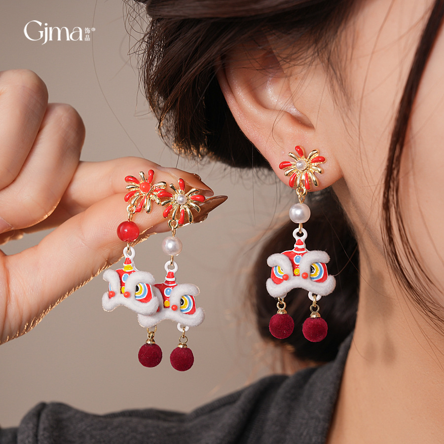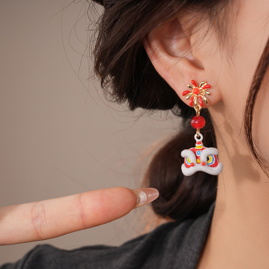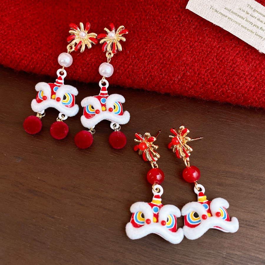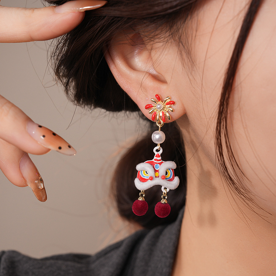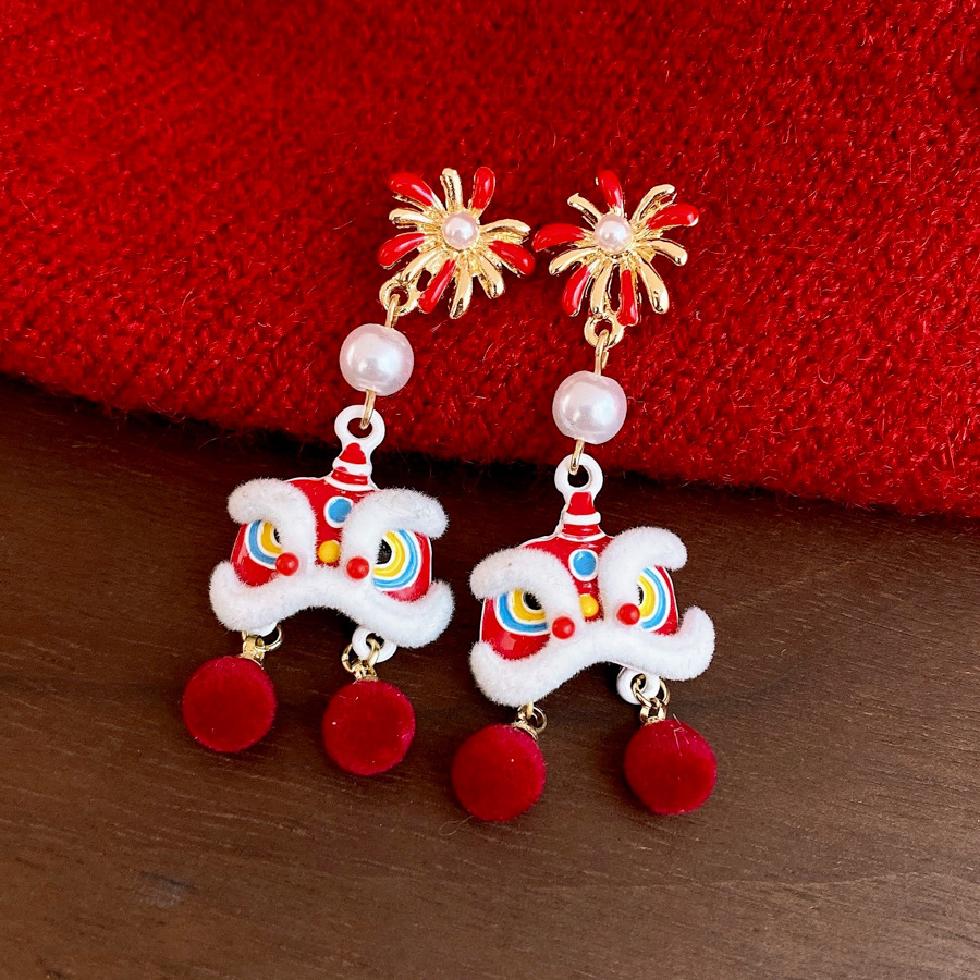 新中式国风红色植绒醒狮花朵珍珠耳环轻奢高级感耳钉时尚精致耳饰 English | 投诉