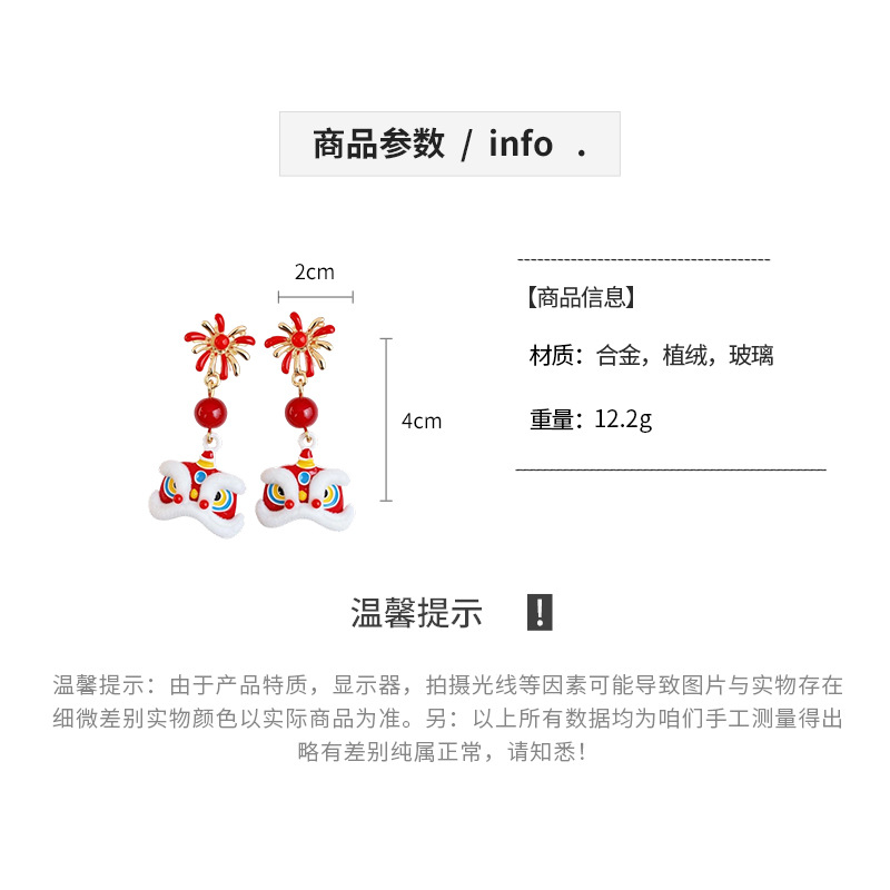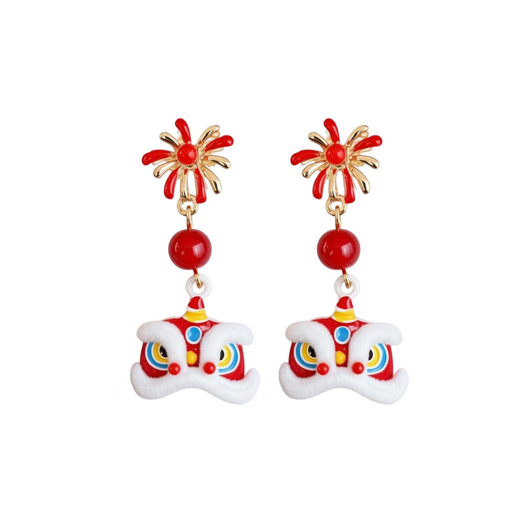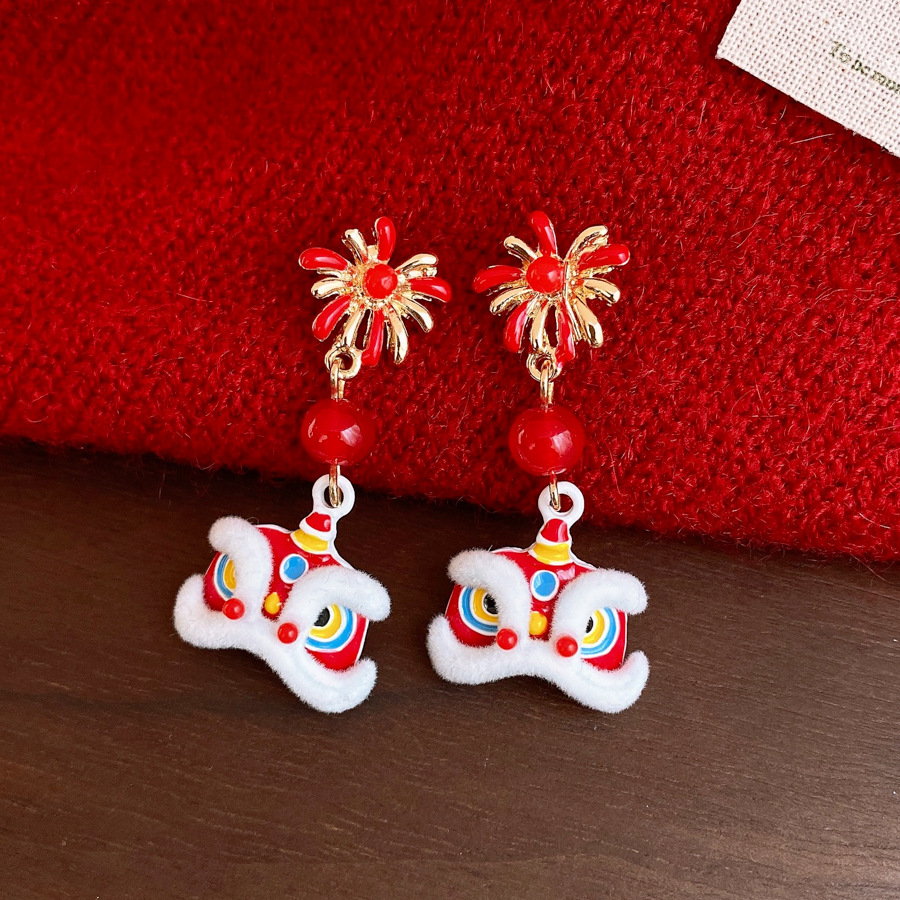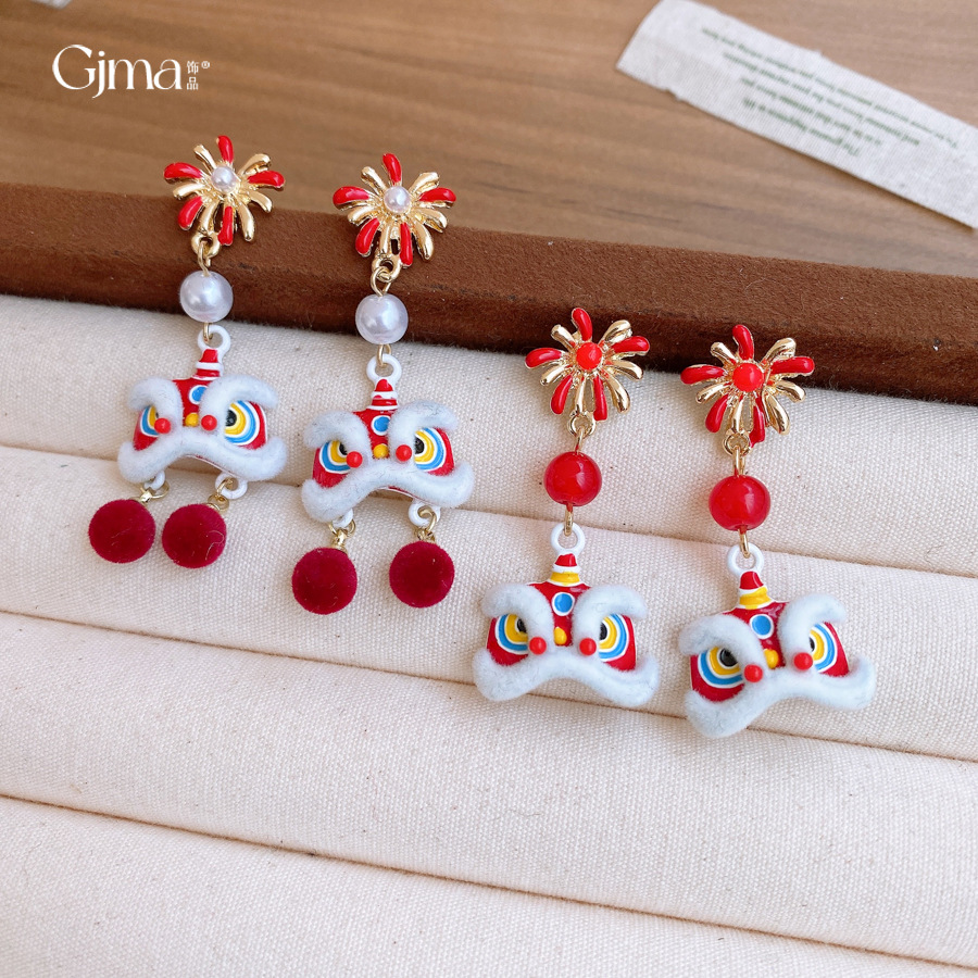 新中式国风红色植绒醒狮花朵珍珠耳环轻奢高级感耳钉时尚精致耳饰 English | 投诉