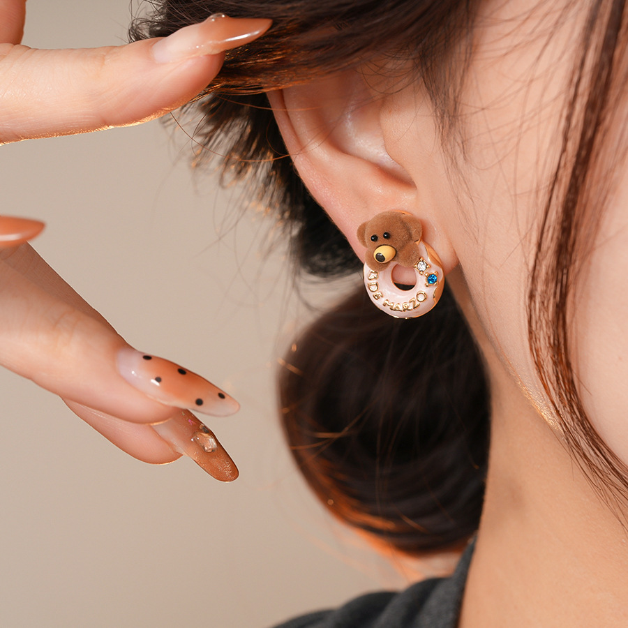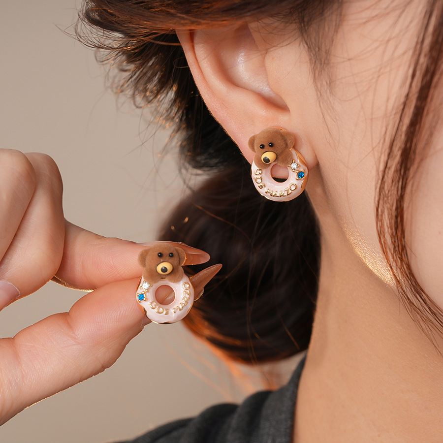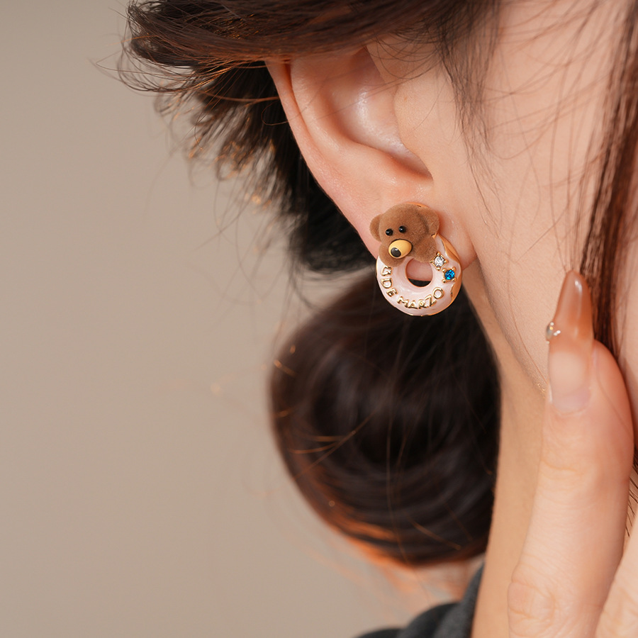 银针可爱甜美植绒小熊滴油圆形耳环轻奢高级感耳钉时尚简约耳饰女