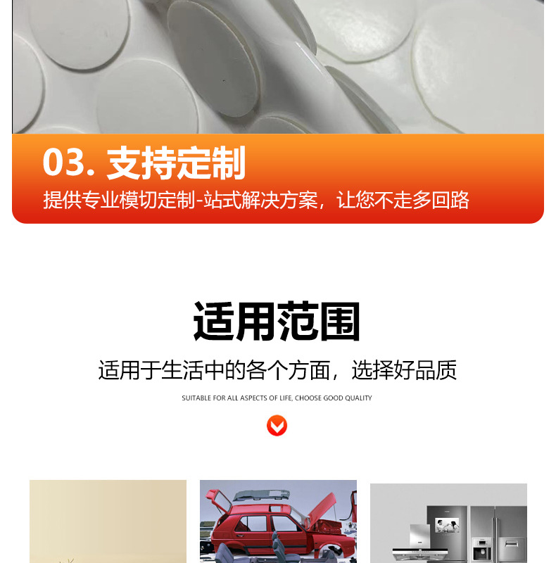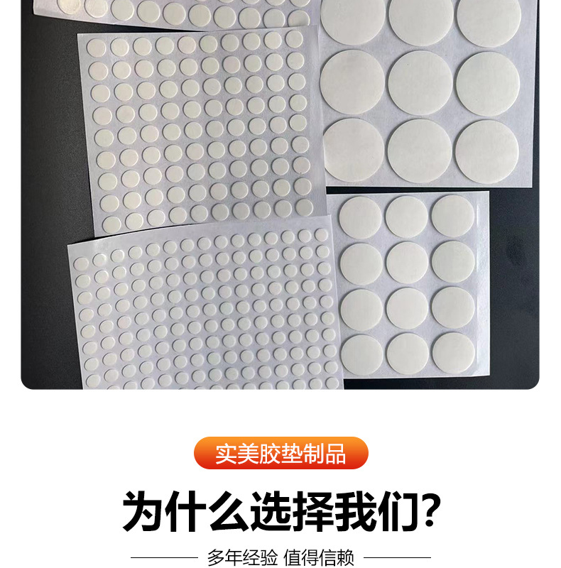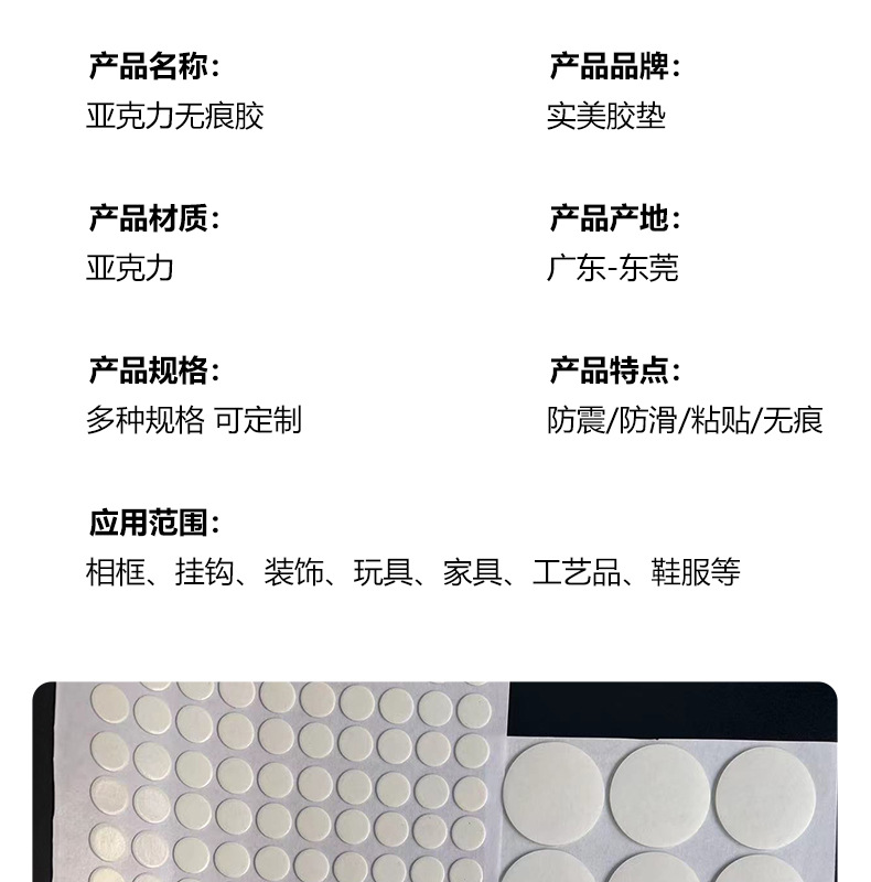 品牌: 实美 主要销售地区: 中国 宽度: 可定制 是否跨境出口专供货源: 否 原产国/地区: 中国 特点: 撕下不留痕 是否进口: 否 有可授权的自有品牌: 否 厚度: 1 货号: 圆形硅胶脚垫 适用范围: 墙面装饰挂件 胶系: 亚克力胶 短期耐温性: 60 长期耐温性: 60 是否双面胶带: 是 延伸系数: 咨询客服 基材: 无痕胶 长度: 可定制 肉厚: 1 撕断方式: 手撕 重量: 0.464 kg/个