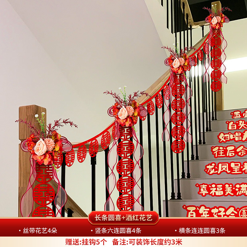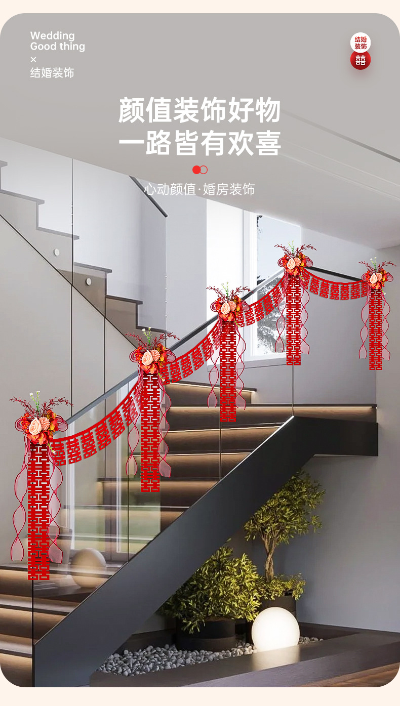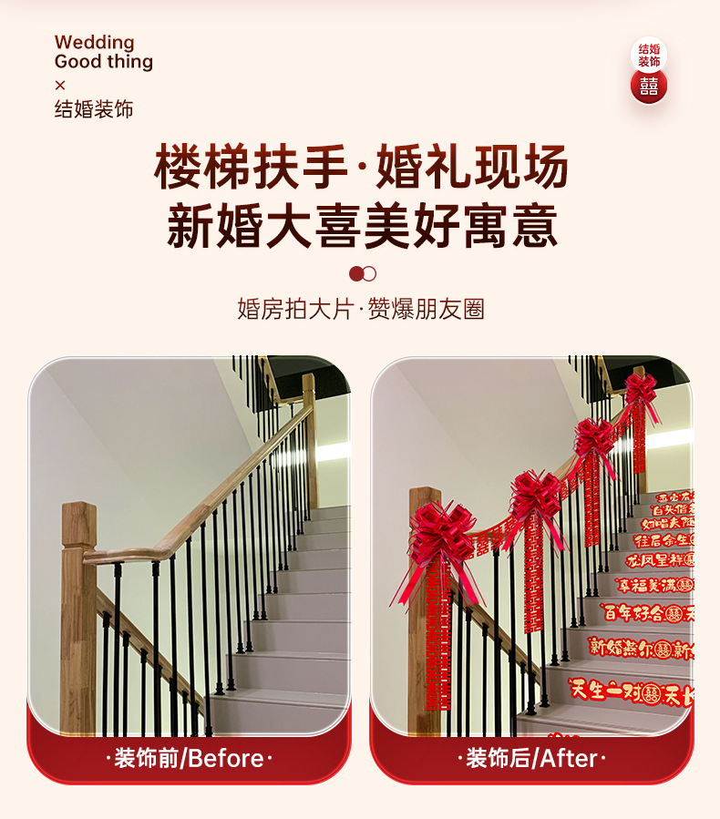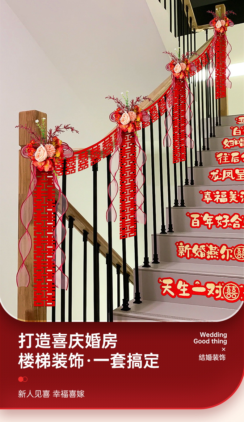 婚房楼梯布置 男方拉花波浪旗楼梯布置 结婚订婚婚礼楼梯扶手彩条结婚楼梯扶手装饰婚房布置套装男方新房婚礼喜字拉花婚庆用品大全