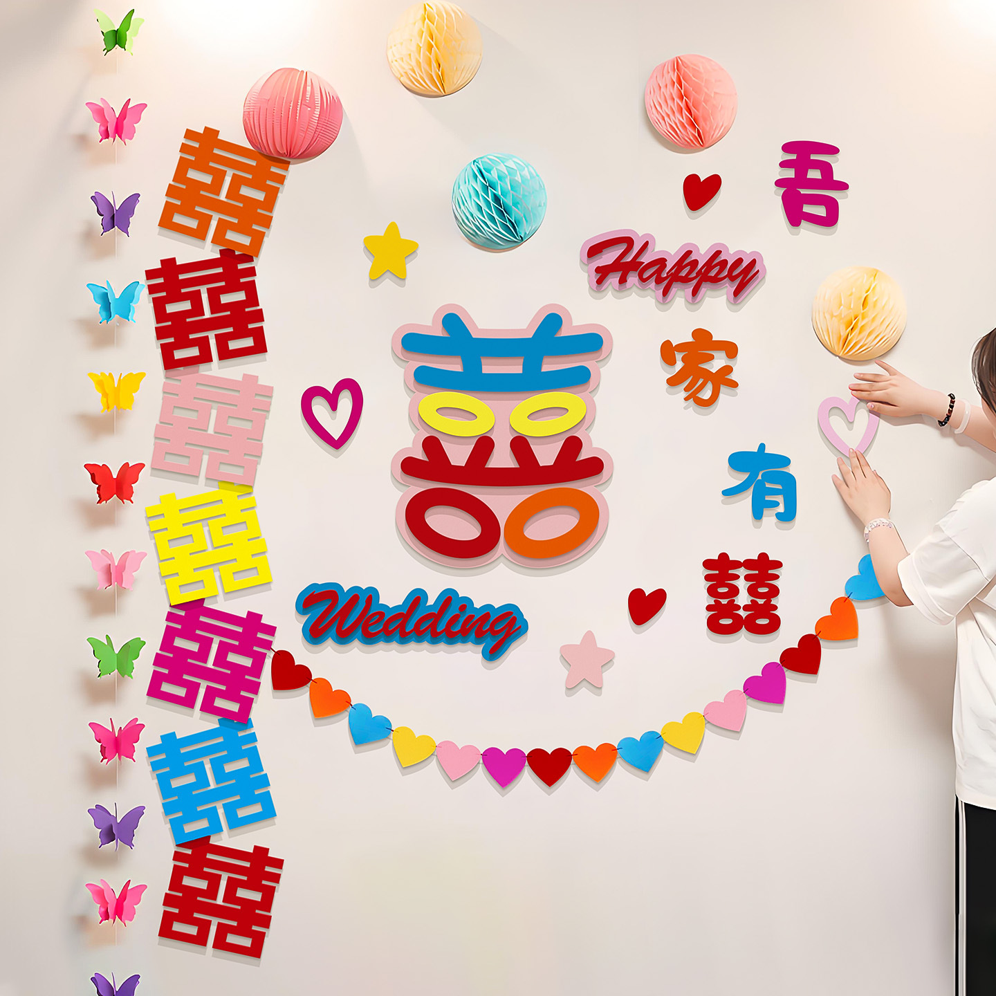 婚房布置多巴胺订婚结婚挂布彩虹气球条幅卧室晨袍拍照背景装饰多巴胺婚房装饰结婚新房男方女方全套喜字贴订婚礼氛围背景墙套装