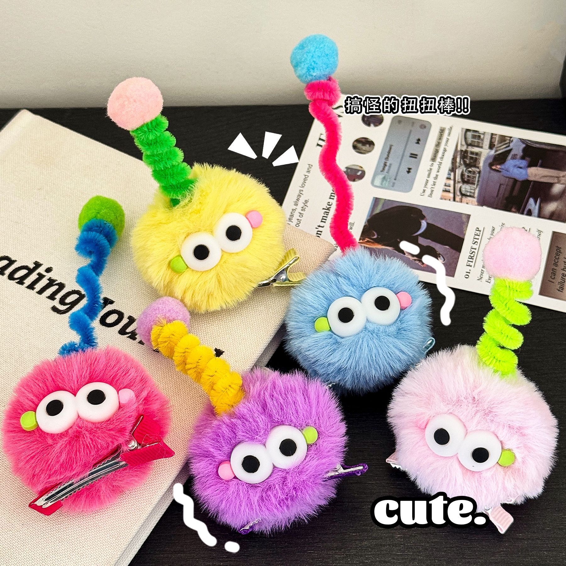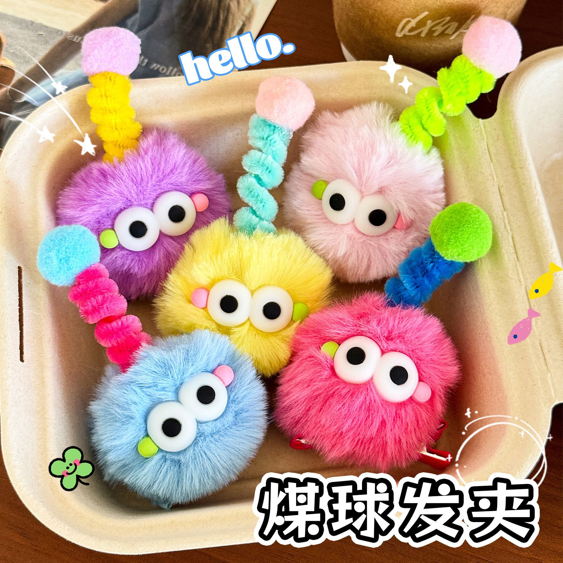 儿童多巴胺可爱煤球发夹少女心刘海侧边夹搞怪天线扭扭棒毛绒发卡 English | 投诉