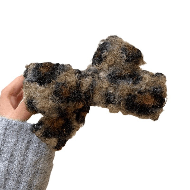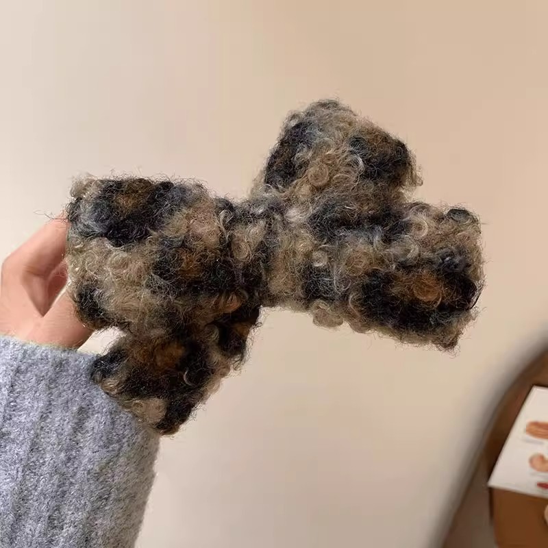 毛绒豹纹蝴蝶结发夹秋冬复古羊羔绒气质丸子头抓夹大号顶夹鲨鱼夹