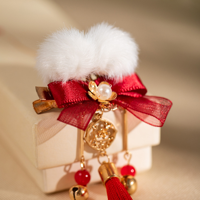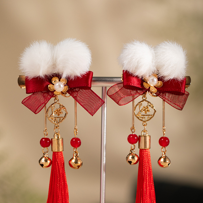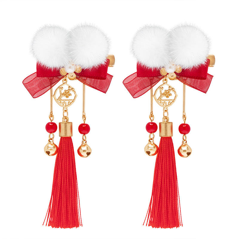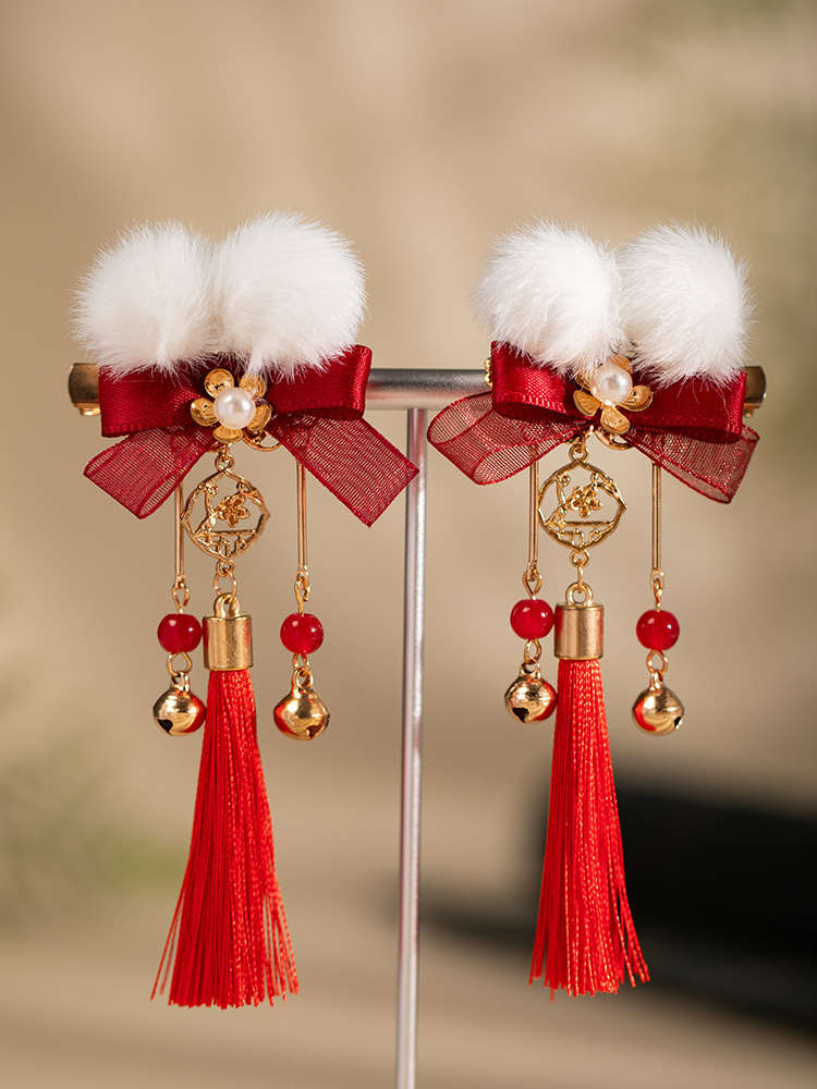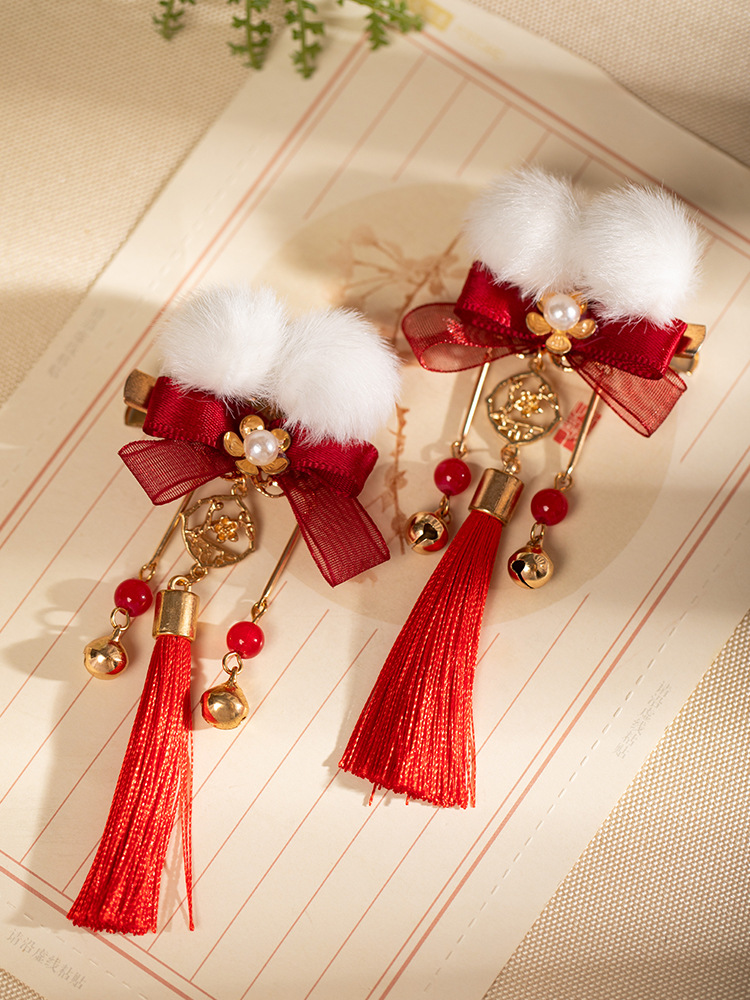 汉服发饰新年毛球儿童发夹红色流苏古风头饰过年喜庆拜年服对夹 English | 投诉