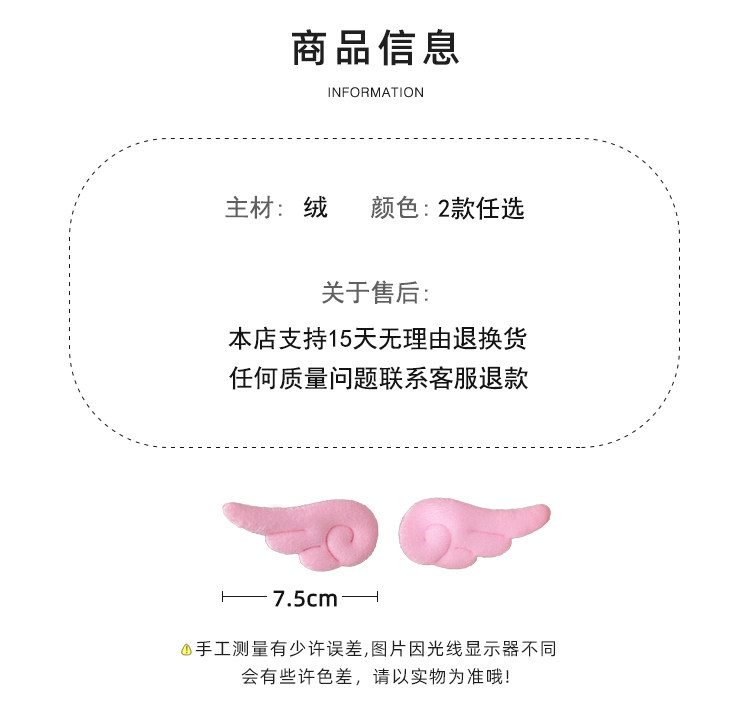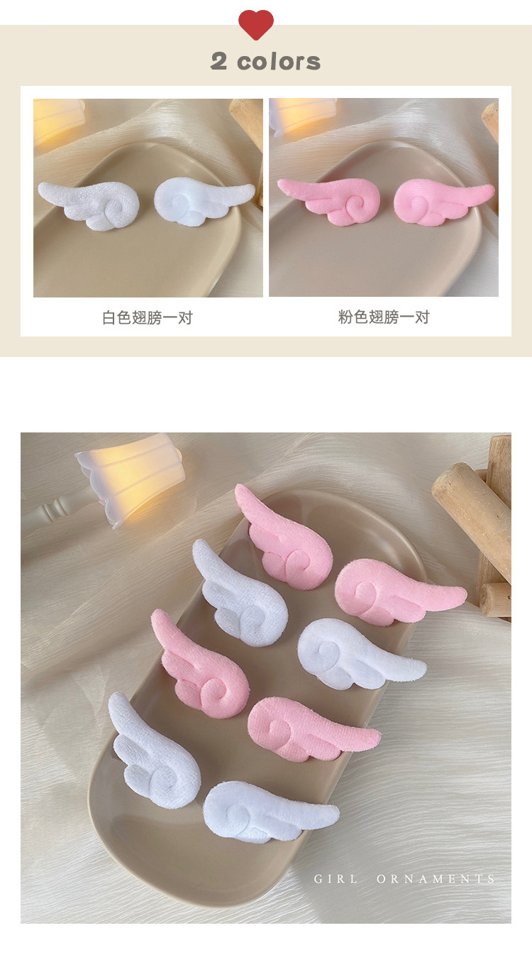 材质: 布料 发夹分类: 边夹 流行元素: 福字 风格: 韩版韩式 处理工艺: 手工 货号: 61240 样式: 女式 产地: 金华 颜色: 1#白色翅膀一对,2#粉色翅膀一对 是否跨境出口专供货源: 是 上市年份/季节: 2021年冬季 风格分类: 清新甜美 生产编号: 3256012310 造型: 翅膀 水晶种类: 无 流行元素分类: 民族/国风 重量: 0.312 kg/对