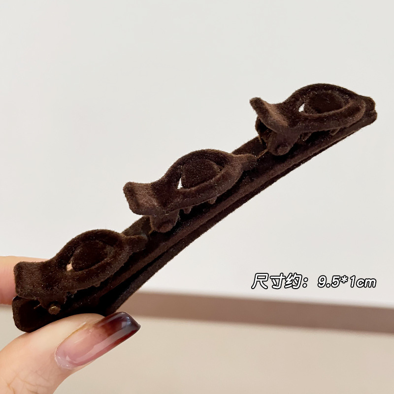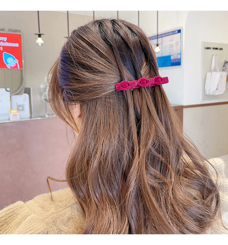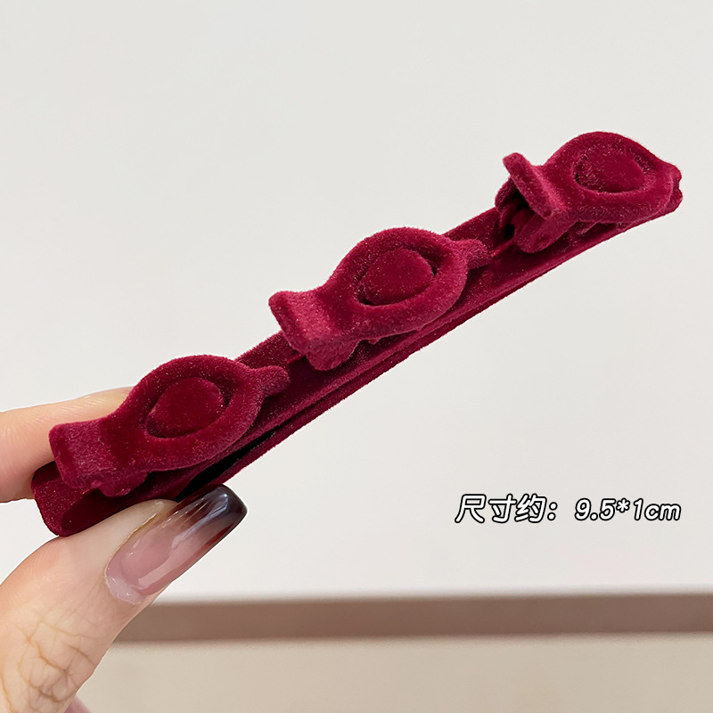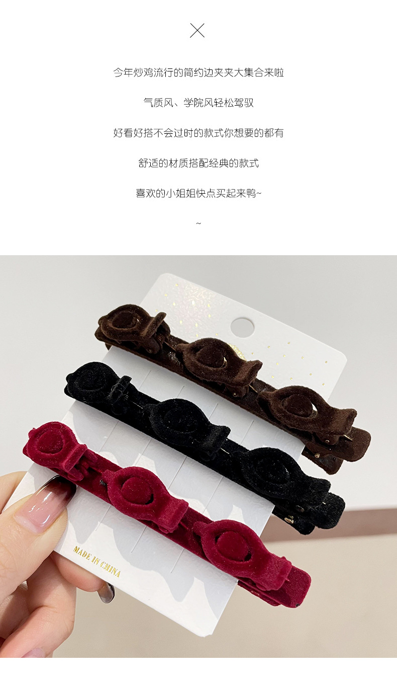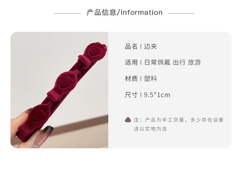 材质: 毛绒 品牌: 其他 发夹分类: 一字夹 流行元素: 一字 风格: 自然 处理工艺: 手工 货号: LIA-Y0983 样式: 一字夹 产地: 金华 主要下游平台: 淘宝,天猫,抖音 颜色: 黑色,红色,咖啡色 有可授权的自有品牌: 否 是否跨境出口专供货源: 否 上市年份/季节: 2025年春季 风格分类: 清新甜美 适用人群: 女式 流行元素分类: 形状/图案 重量: 0.333 kg/个
