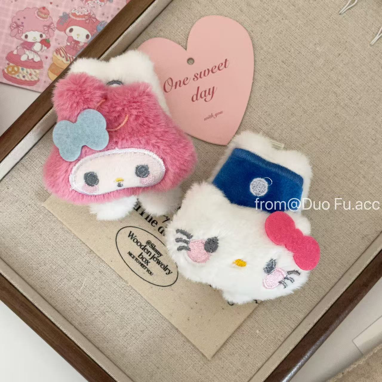 材质: 毛绒 品牌: 其他 发夹分类: 发夹 流行元素: 蝴蝶结 风格: 卡通 处理工艺: 手工 货号: C—302 样式: 卡通发夹 产地: 义乌 主要下游平台: 淘宝,京东,快手,天猫,拼多多,抖音 颜色: 毛绒KT发夹1个,毛绒美乐蒂发夹1个 有可授权的自有品牌: 否 是否跨境出口专供货源: 否 上市年份/季节: 2025夏季 风格分类: 清新甜美 适用人群: 女式 流行元素分类: 形状/图案 重量: 0.214 kg/个