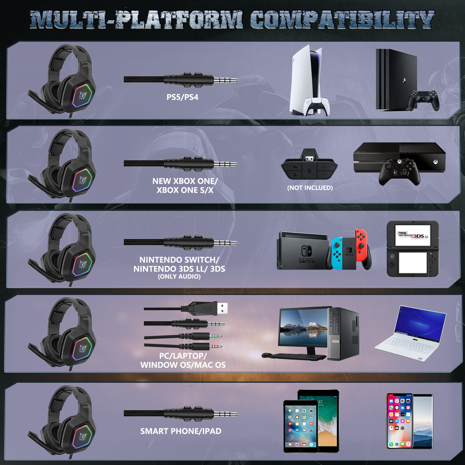 强大的兼容性 - PS4,Xbox One S,Xbox One,Xbox one X,PS4 Pro,PS 4 Slim,PC,笔记本电脑,PSP,Mac,平板电脑,Nintendo Switch,Nintendo Switch 3DS,Nintendo Switch 3ds LL的游戏耳机。连接旧版Xbox One控制器时需要额外的Microsoft适配器(不包含)。