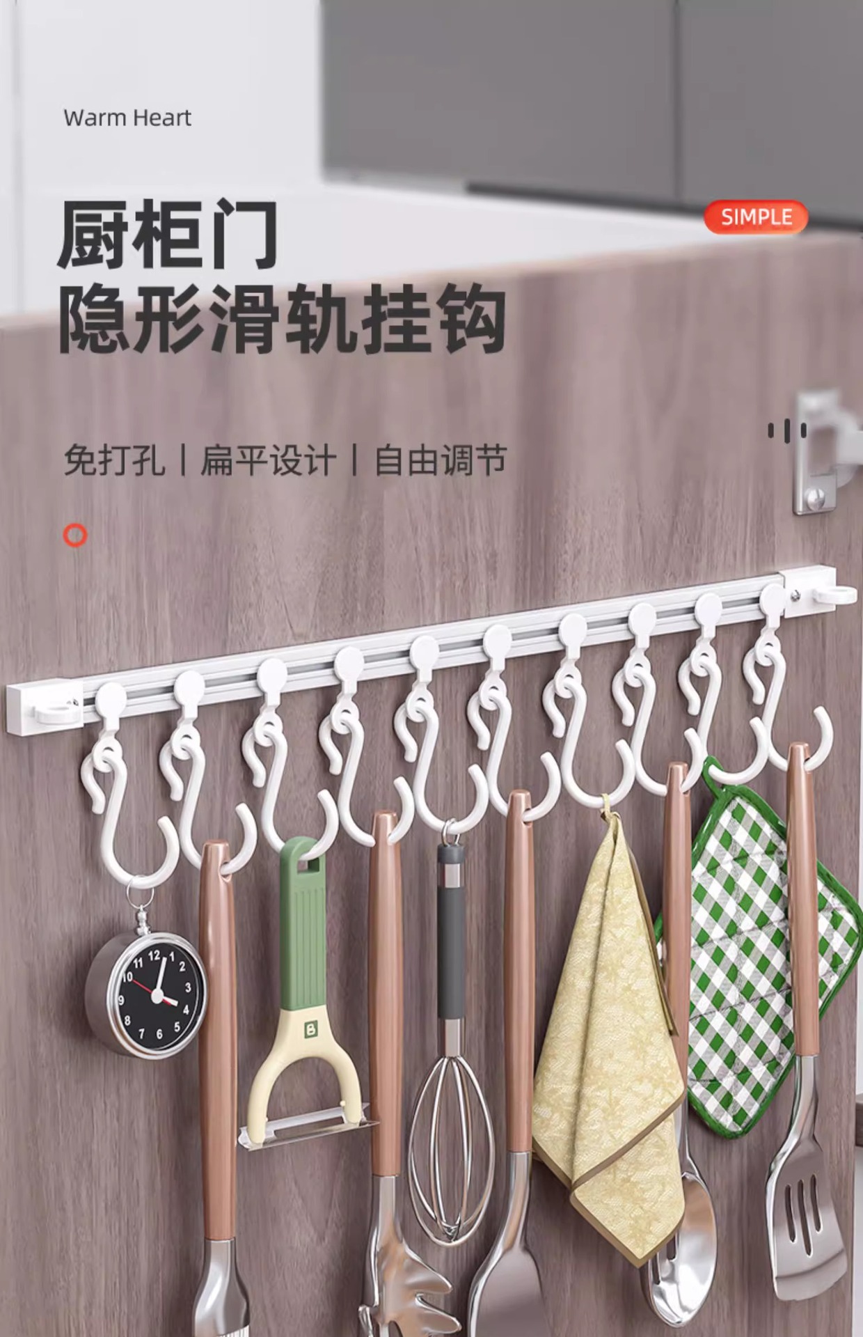 橱柜门后滑动轨道挂钩S钩厨房免打孔粘钩神器铲子壁挂收纳置物架