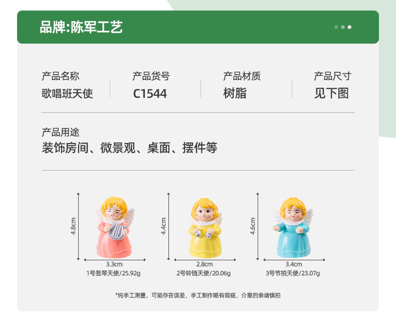 材质: 树脂 类别: 人物 风格: 卡通 包装: 普通包装 货号: C1544 是否专利货源: 否 颜色: 1号竖琴天使,2号铃铛天使,3号节拍天使 尺寸: 歌唱班天使3款 是否属于礼品: 否