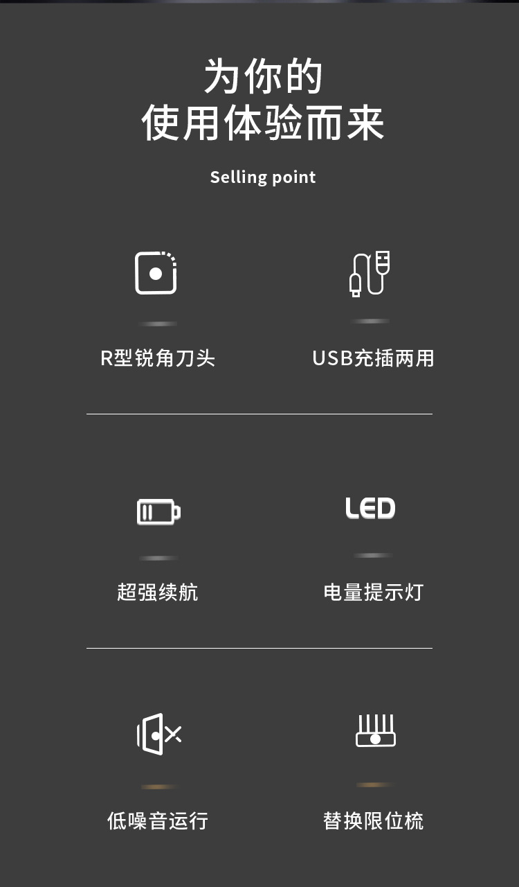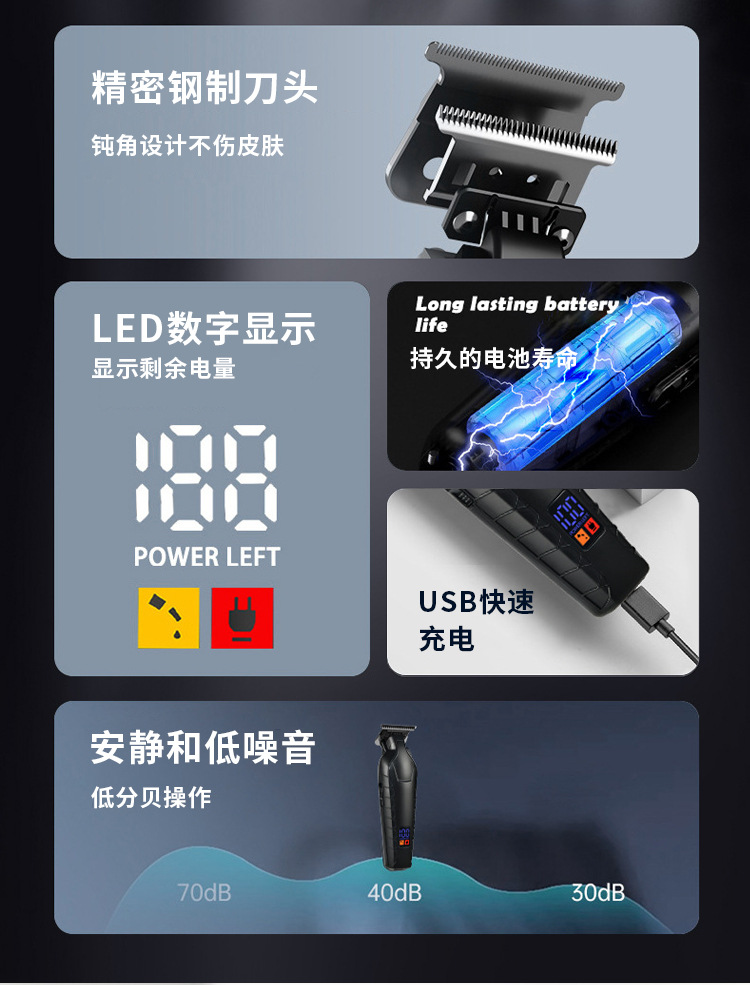 产品优势:超强动力,低噪音设计,持久续航。用户痛点解决方案:解决理发师操作繁琐、客户体验差问题,提升效率与舒适度。