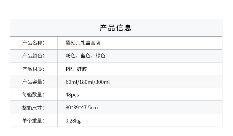 品牌: 美婴堂 口径规格: 宽口径 是否带柄: 不带柄 形状: 弧形 货号: LH-1505 加印LOGO: 可以 装箱数量: 48 加工定制: 是 是否进口: 否 商品条形码: 见包装 容量: 粉色套装,蓝色套装,绿色套装 是否跨境出口专供货源: 是