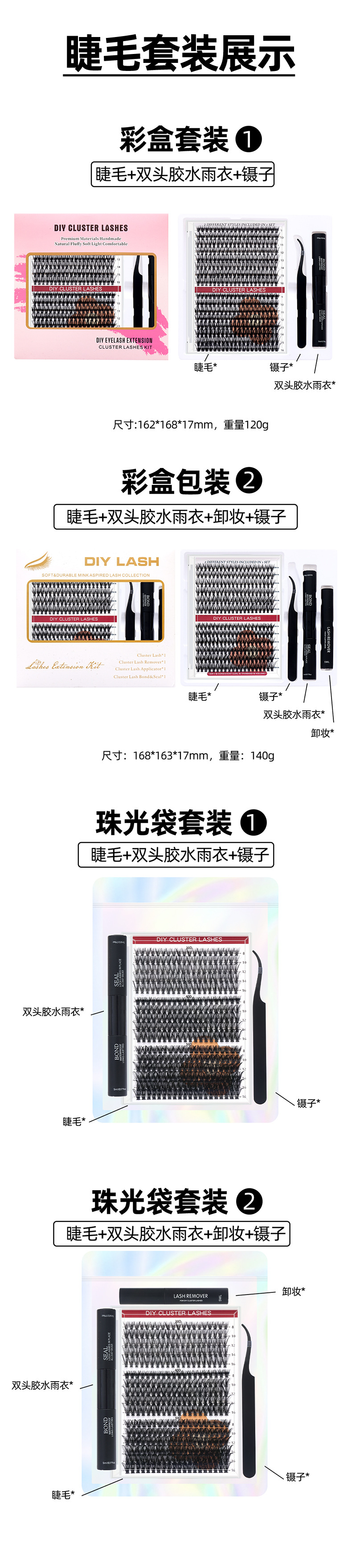 | 珠光袋套装①(睫毛+双头胶水+镊子) | ¥1896 | 4999个可售 |
