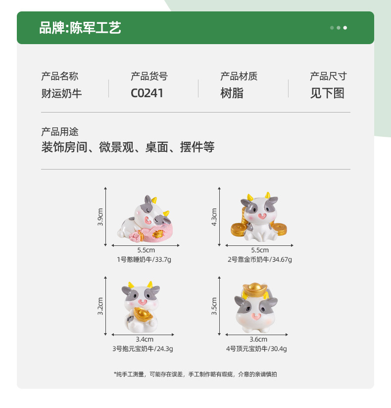 材质: 树脂 类别: 树脂工艺品 风格: 卡通 包装: 普通包装 货号: C0241 是否专利货源: 否 颜色: 1号憨睡奶牛,4号顶元宝奶牛 尺寸: 财运奶牛4款 是否属于礼品: 否
