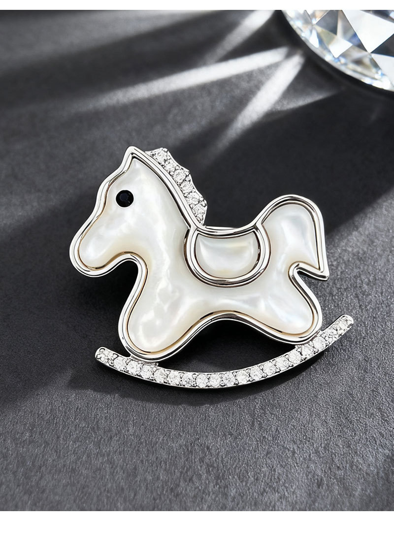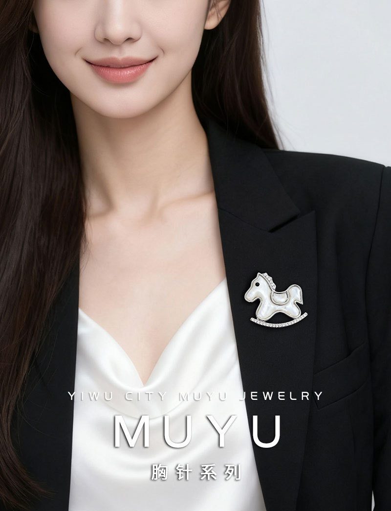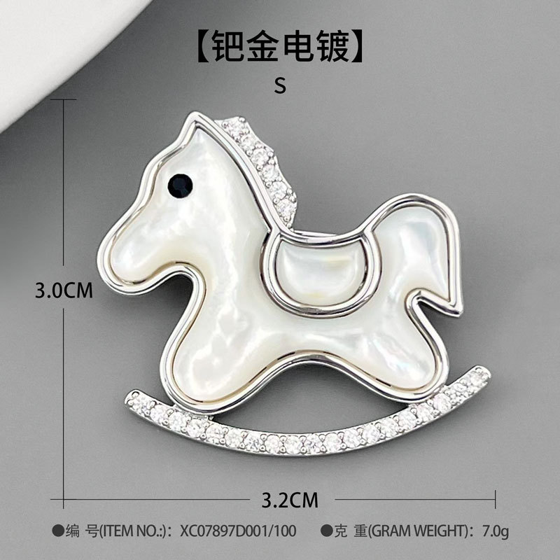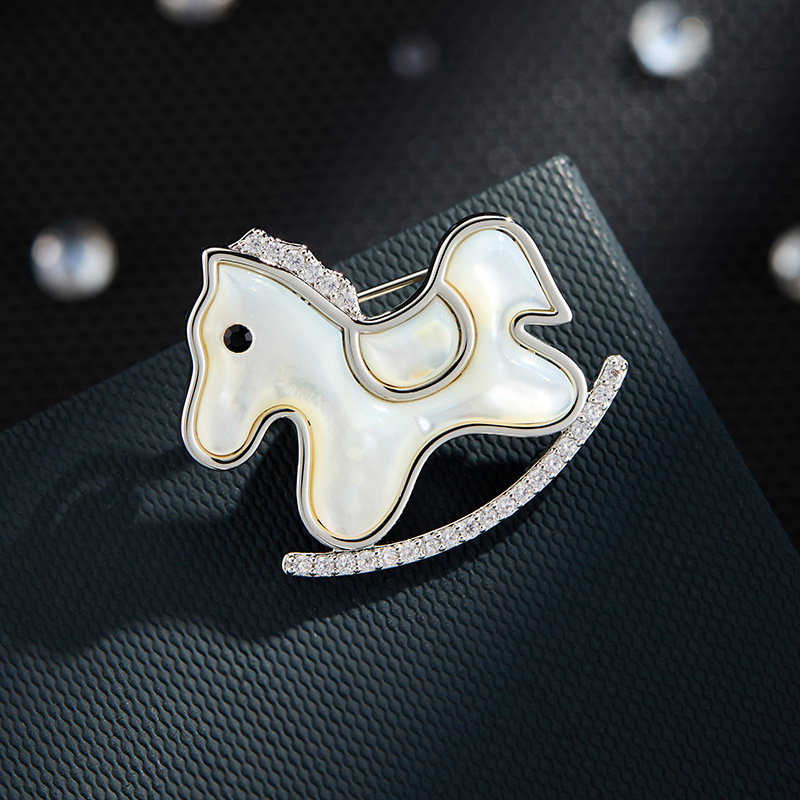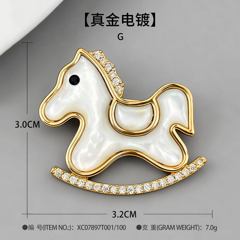 轻奢萌系天然贝母木马胸针铜合金镶锆石真金电镀小马别针爆款胸花