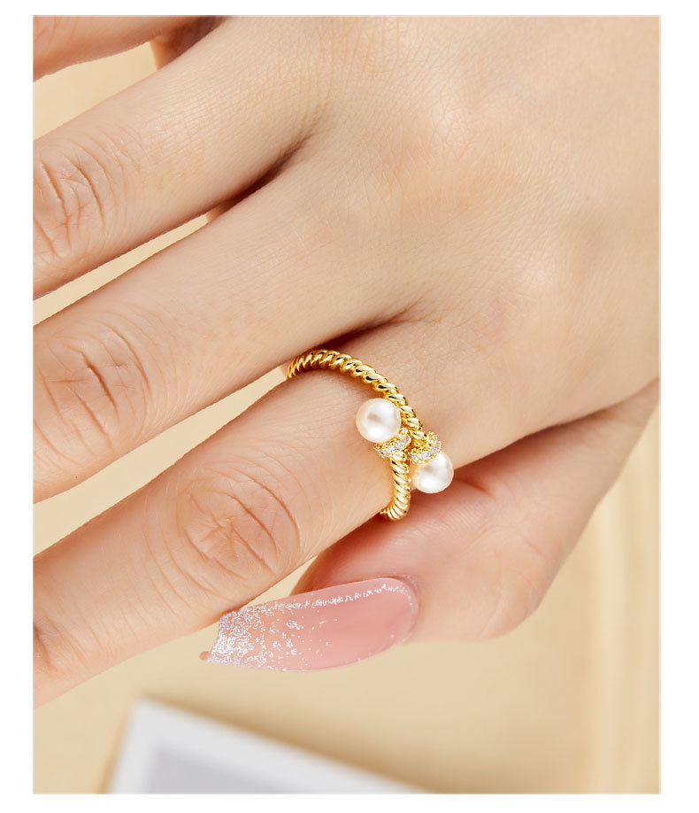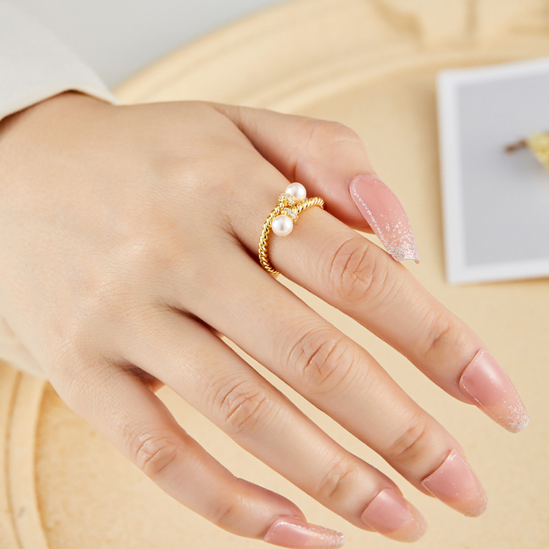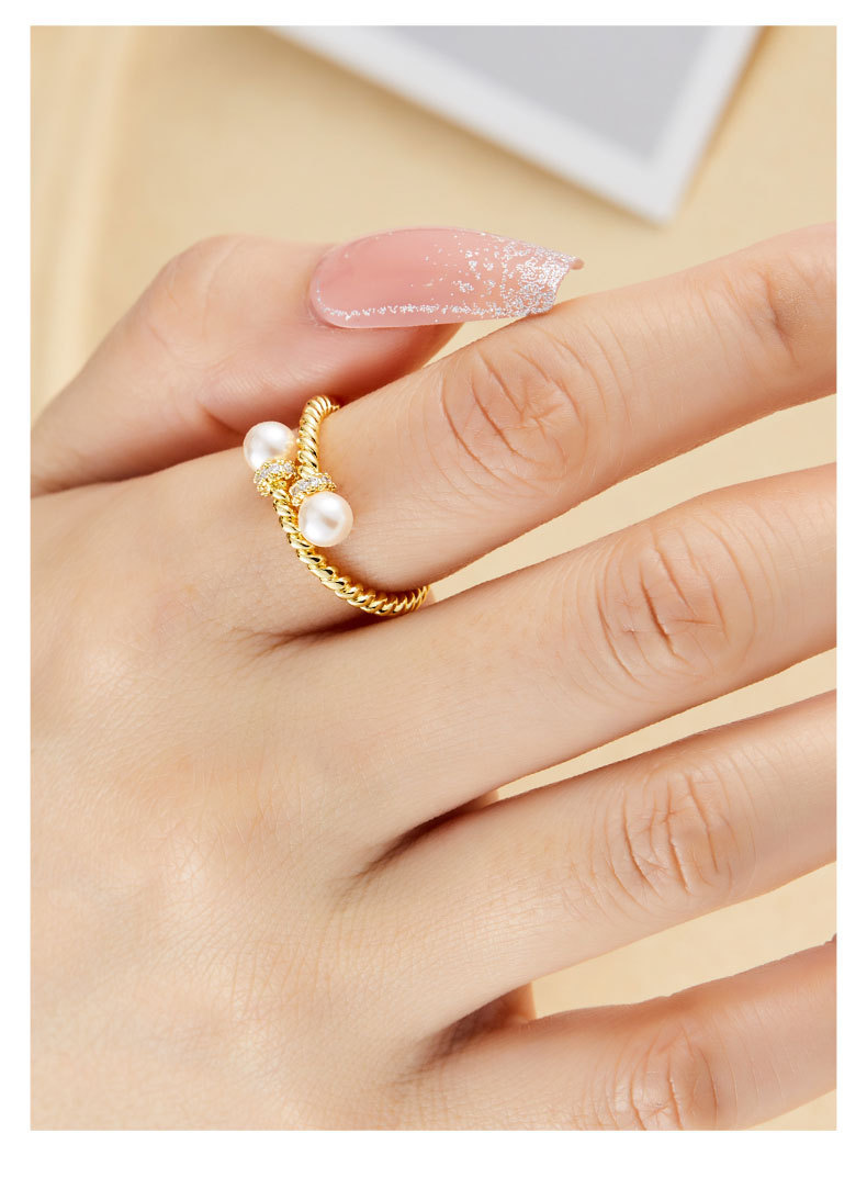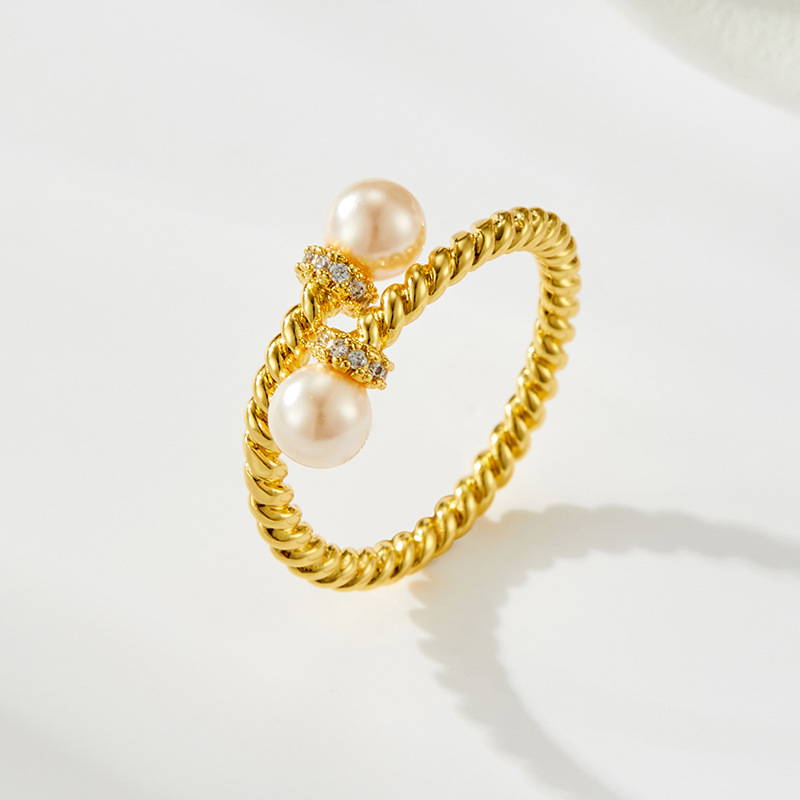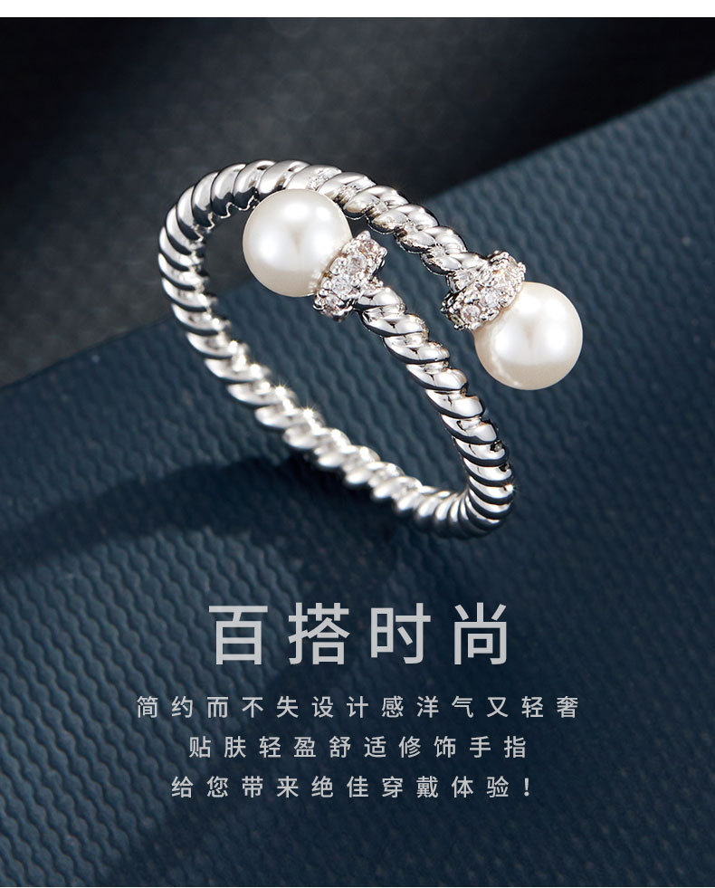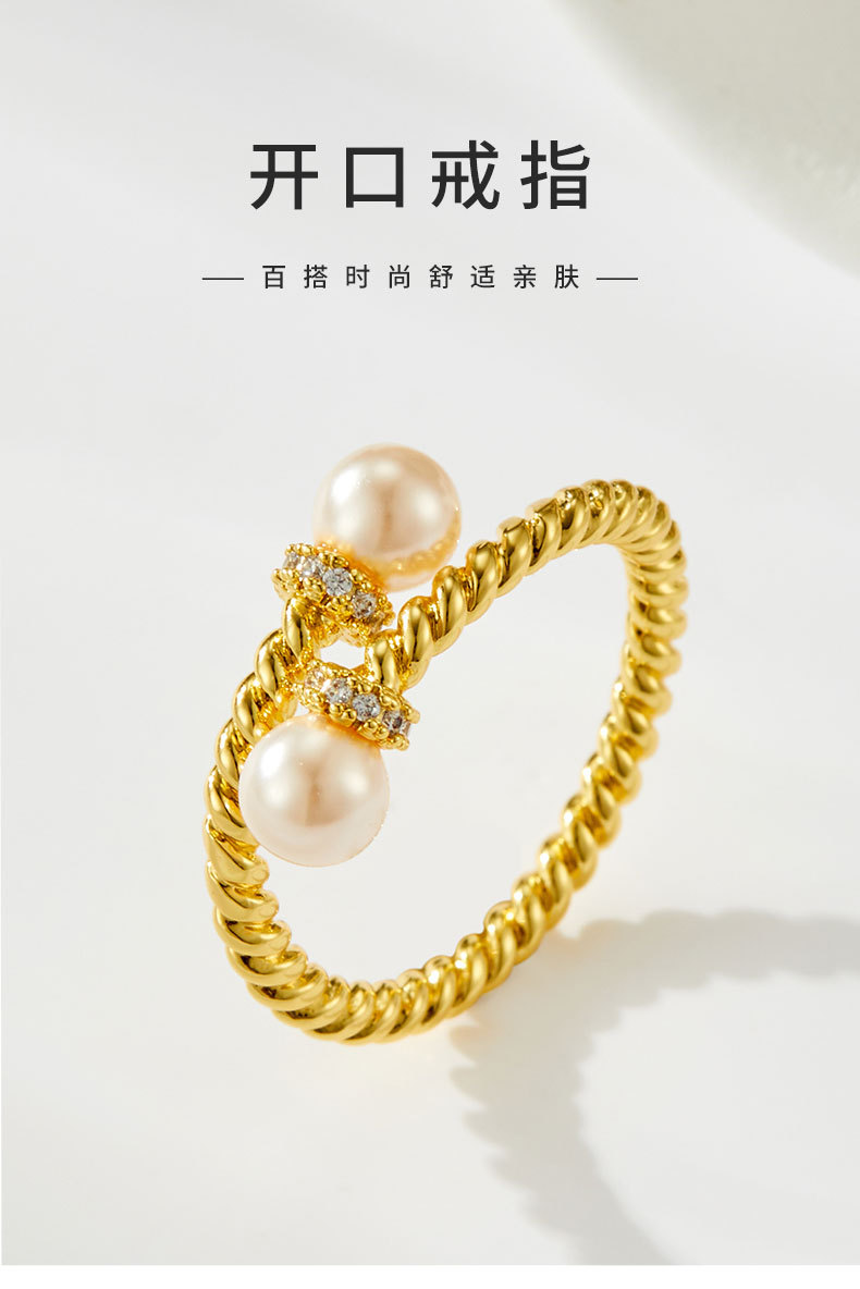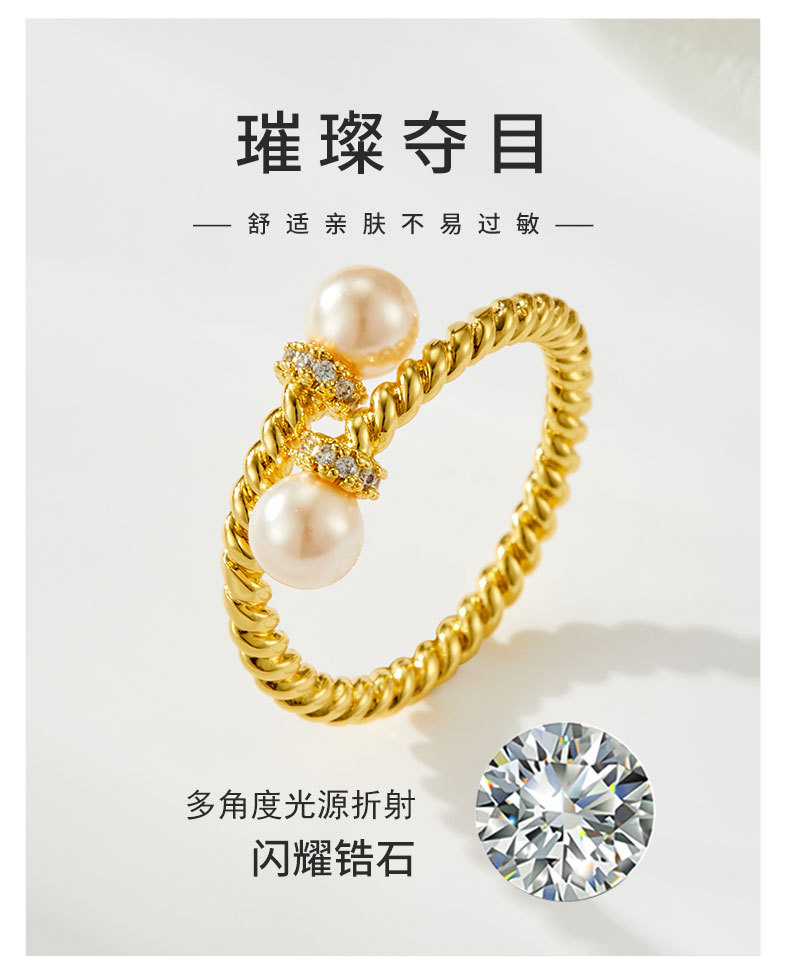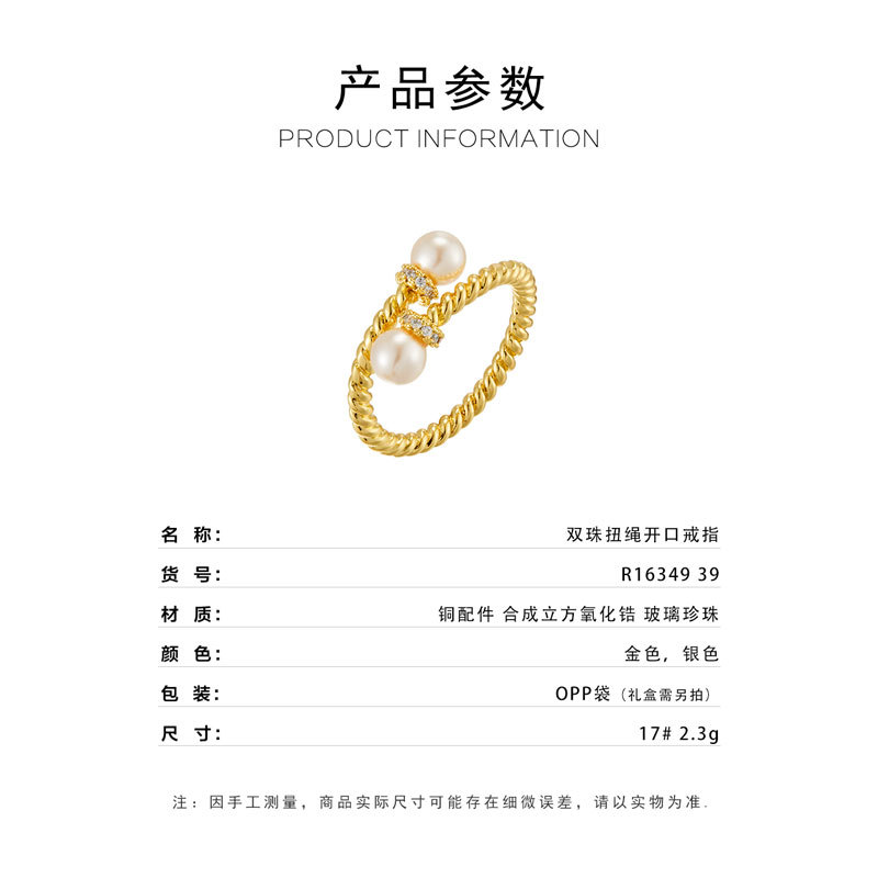 复古交叉麻花纹玻璃珍珠开口戒指可调节设计百搭指环轻奢女食指戒