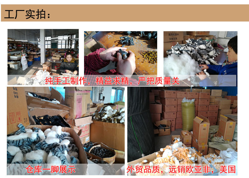 产品特点:产品外部采用优质仿真人造短毛绒,内部采用环保聚乙烯硬壳,由我公司专业技师根据动物的表情和动作研制模型,熟练工人制作成品,产品造型逼真,栩栩如生,产品远销欧美、日本等国际市场,深受广大客户喜爱。我公司产品品种繁多,颜色各异,规格众多,欢迎大家前来选购、洽谈。