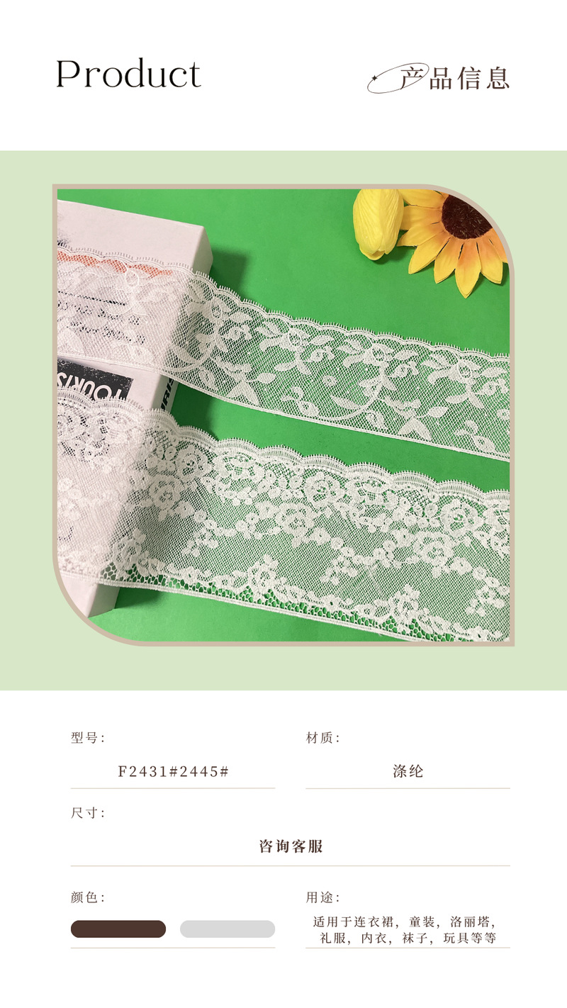 品牌: 钰绫 风格: 手工 货号: F2431#2445#210245 材质: 涤纶 适用范围: 围巾,DIY手工,蕾丝内衣,家居,家纺用 工艺: 水溶刺绣 颜色: 黑白色其他颜色可以染 定制: 支持定制 货源类别: 现货 重量: 0.008 kg/码