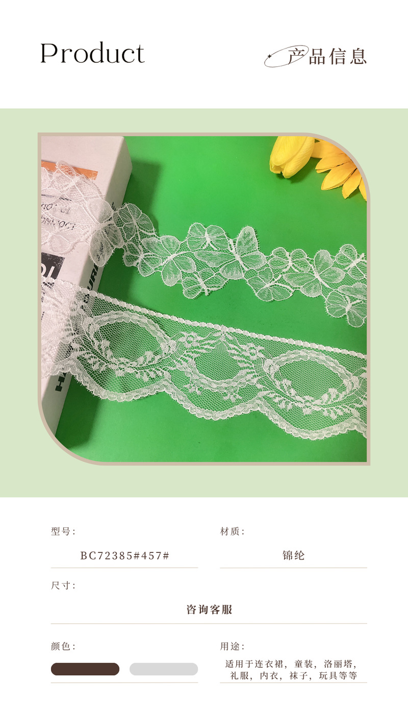 品牌: 钰绫 风格: 中国风 货号: 457#BC72385#211125 材质: 锦纶丝 适用范围: 围巾,DIY手工,蕾丝内衣,家居,睡衣, 工艺: 针织/经编 颜色: 黑白色其他颜色可以染 货源类别: 现货 定制: 支持定制 重量: 0.008 kg/码