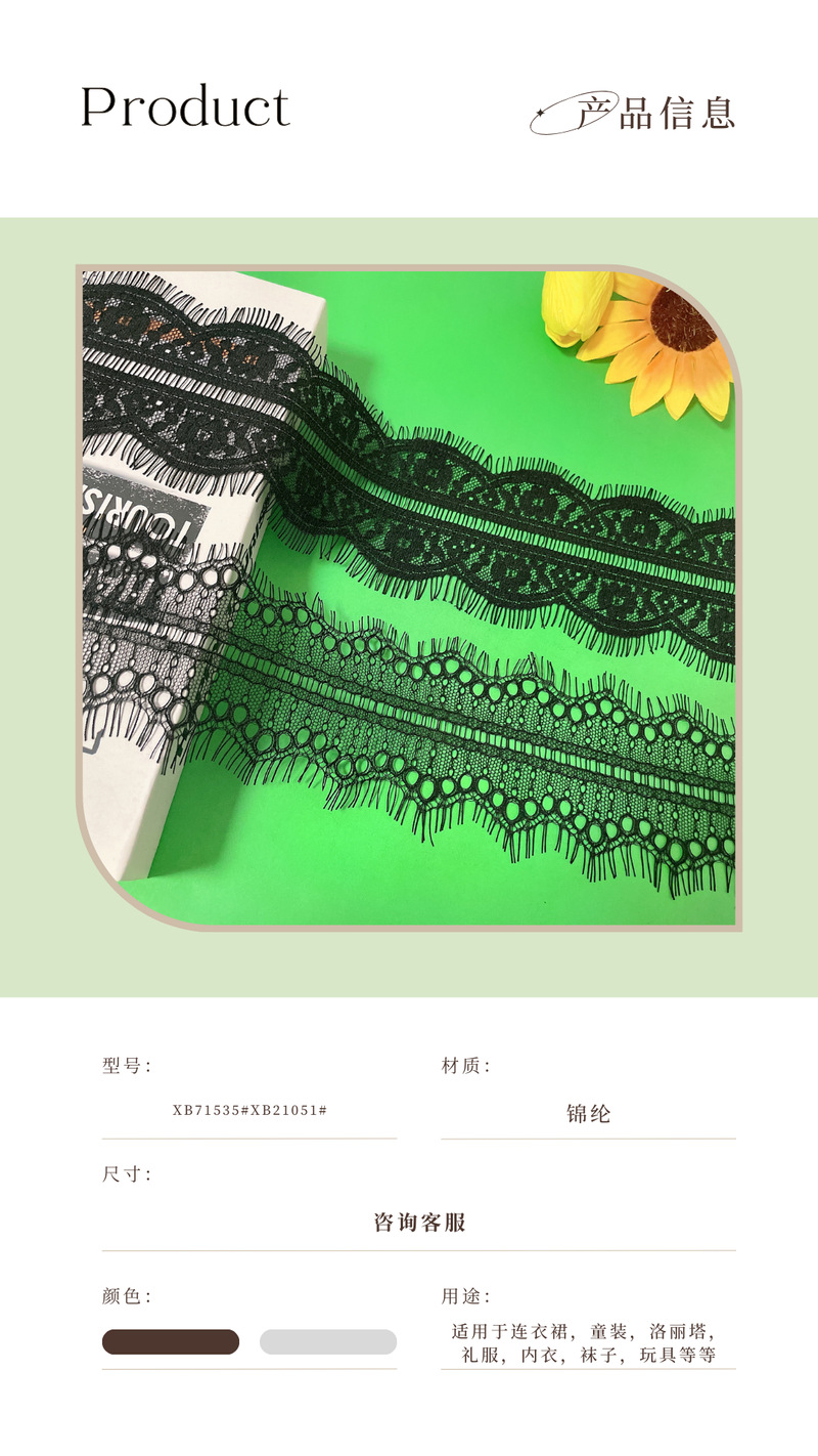 品牌: 钰绫 风格: 法式刺绣蕾丝立体刺绣 货号: XB72843#XB21051#2922 材质: 锦纶丝 适用范围: 围巾,DIY手工,蕾丝内衣,无缝内裤,睡 工艺: 针织/经编 货源类别: 现货 定制: 支持定制 颜色: 黑白色其他颜色可以染 重量: 0.008 kg/条