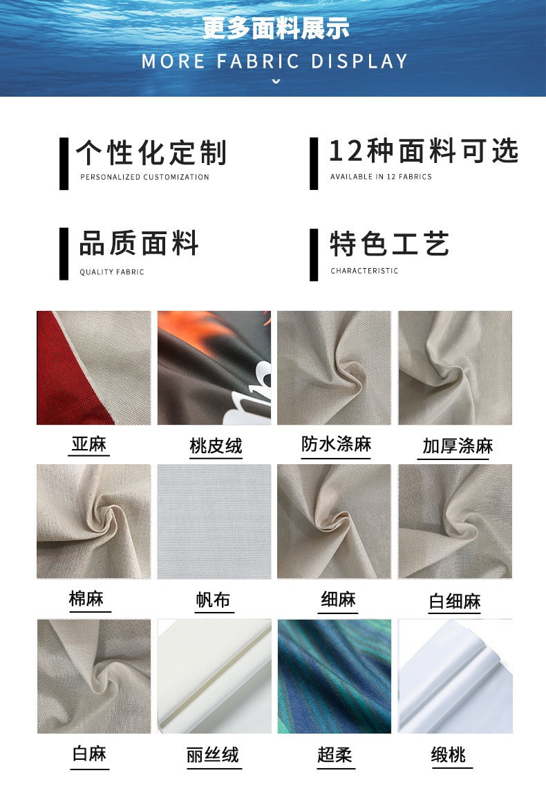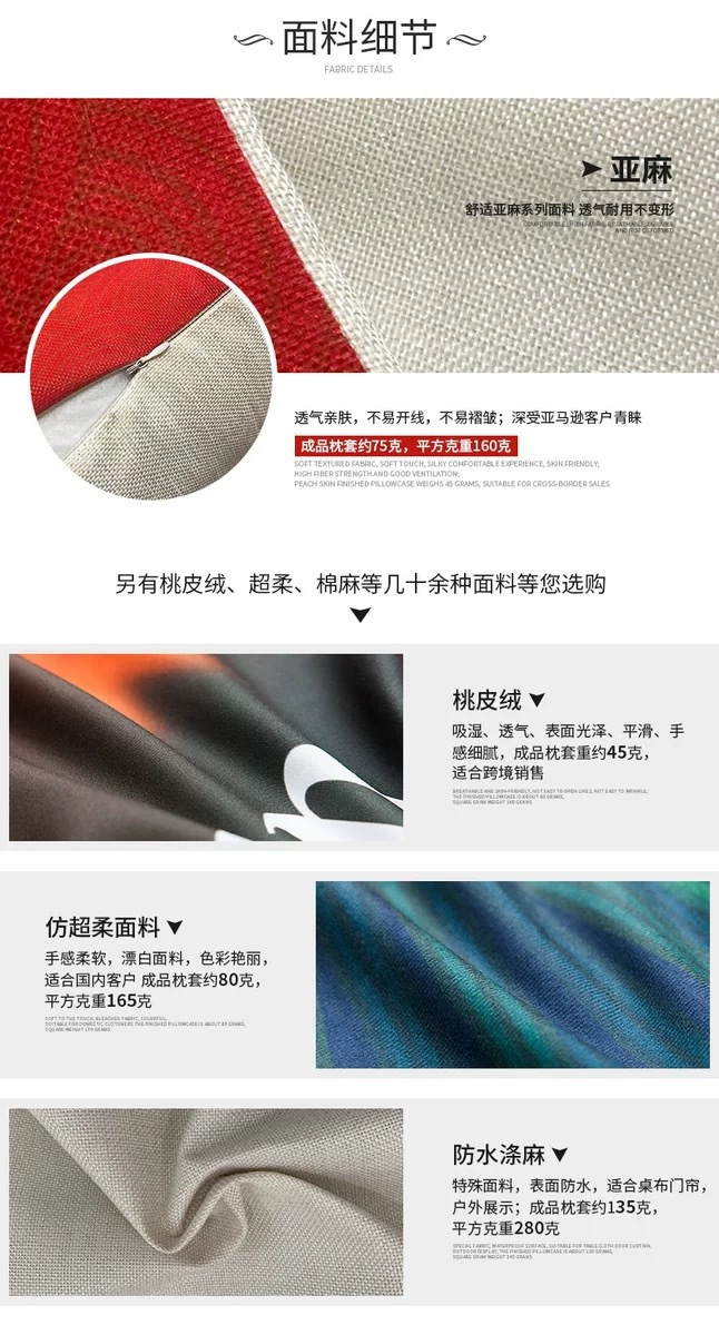 本店有超柔(超短绒),涤纶磨毛(桃皮绒),亚麻,棉麻四种材质,所有图案均可定制以上4种材料,购买时请和客服说明你需要的材质哦.