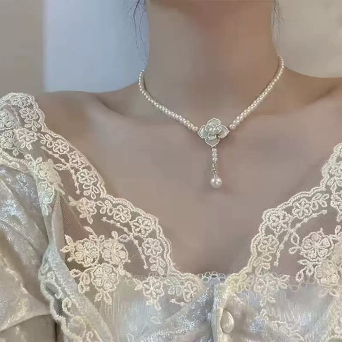 法式复古珍珠项链气质山茶花瓣锁骨链新娘颈链婚纱晚礼服三件套装 English | 投诉