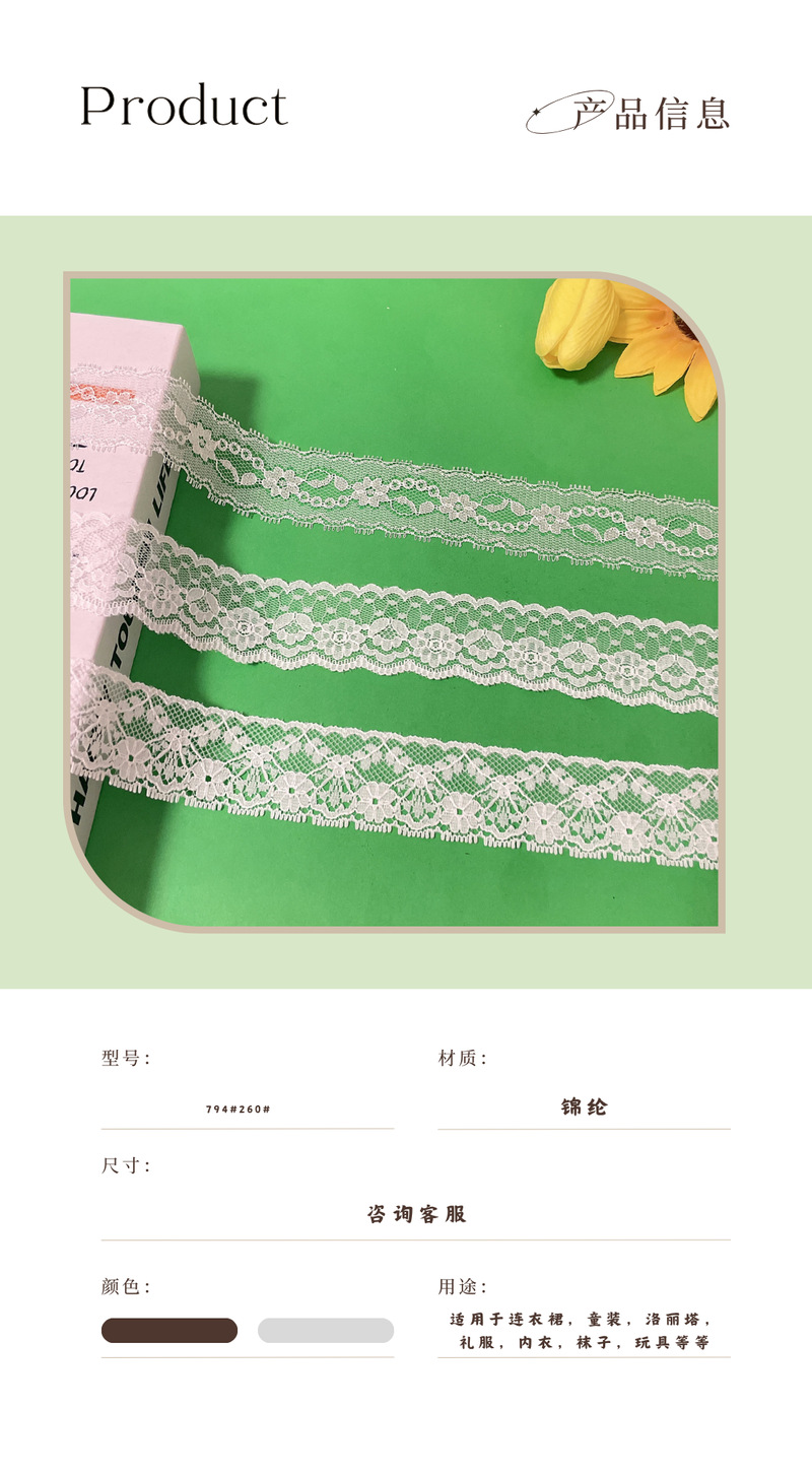 品牌: 钰绫 风格: 手工 货号: 794#260#211105 材质: 锦纶丝 适用范围: 围巾,DIY手工,蕾丝内衣,家居,睡衣, 工艺: 针织/经编 定制: 支持定制 货源类别: 现货 颜色: 黑白色其他颜色可以染 重量: 0.008 kg/码