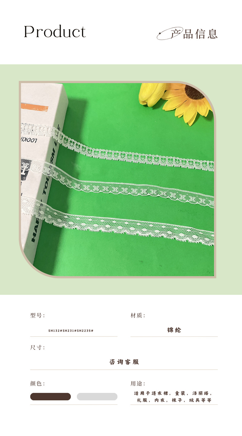 品牌: 钰绫 风格: 小清新 货号: SH132#SH231#SH2235#2 材质: 锦纶丝 适用范围: 鞋帽,DIY手工,蕾丝内衣,饰品,家居, 工艺: 针织/经编 定制: 支持定制 颜色: 黑白色其他颜色可以染 货源类别: 现货 重量: 0.008 kg/码