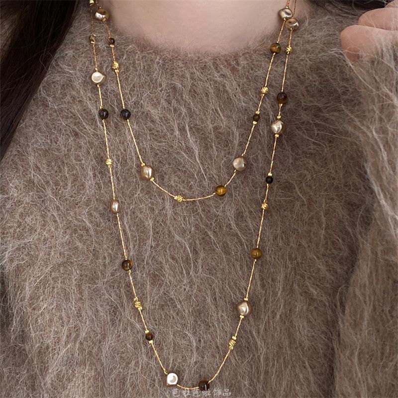 美拉德虎眼石珍珠项链女秋冬季2025爆款百搭轻奢高级感长款毛衣链